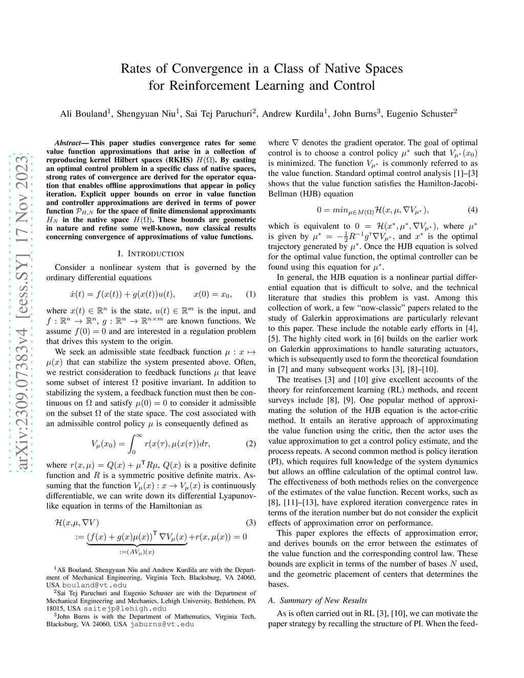 This paper studies convergence rates for some value function approximations that arise in a collection of reproducing kernel Hilbert spaces (RKHS) . By casting an optimal control problem in a specific class of native spaces, strong rates of convergence are derived for the operator equation that enables offline approximations that appear in policy iteration. Explicit upper bounds on error in value function and controller approximations are derived in terms of power function for the space of finite dimensional approximants in the native space . These bounds are geometric in nature and refine some well-known, now classical results concerning convergence of approximations of value functions.