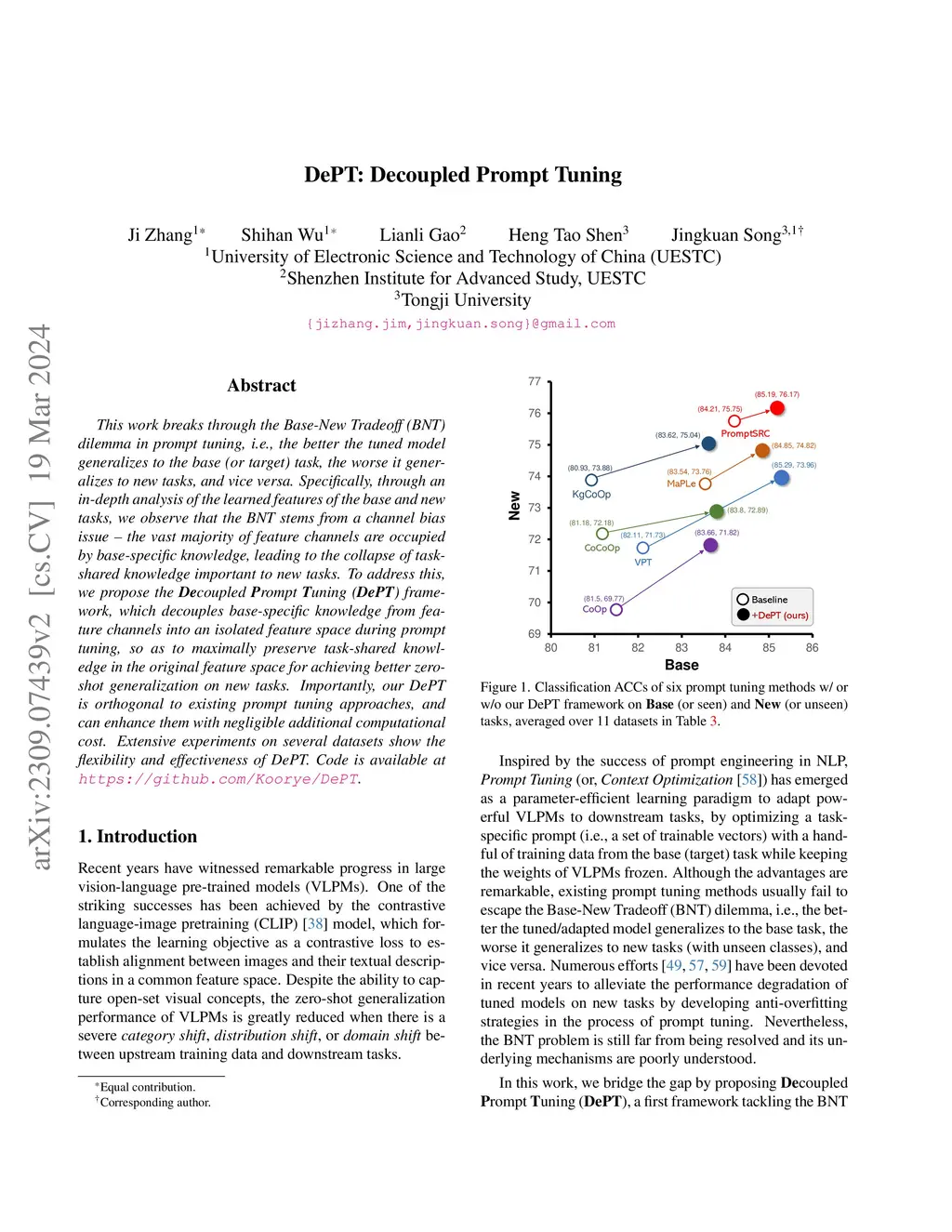 This work breaks through the Base-New Tradeoff (BNT)dilemma in prompt tuning, i.e., the better the tuned model generalizes to the base (or target) task, the worse it generalizes to new tasks, and vice versa. Specifically, through an in-depth analysis of the learned features of the base and new tasks, we observe that the BNT stems from a channel bias issue, i.e., the vast majority of feature channels are occupied by base-specific knowledge, resulting in the collapse of taskshared knowledge important to new tasks. To address this, we propose the Decoupled Prompt Tuning (DePT) framework, which decouples base-specific knowledge from feature channels into an isolated feature space during prompt tuning, so as to maximally preserve task-shared knowledge in the original feature space for achieving better zero-shot generalization on new tasks. Importantly, our DePT is orthogonal to existing prompt tuning methods, hence it can improve all of them. Extensive experiments on 11 datasets show the strong flexibility and effectiveness of DePT. Our code and pretrained models are available at https://github.com/Koorye/DePT.