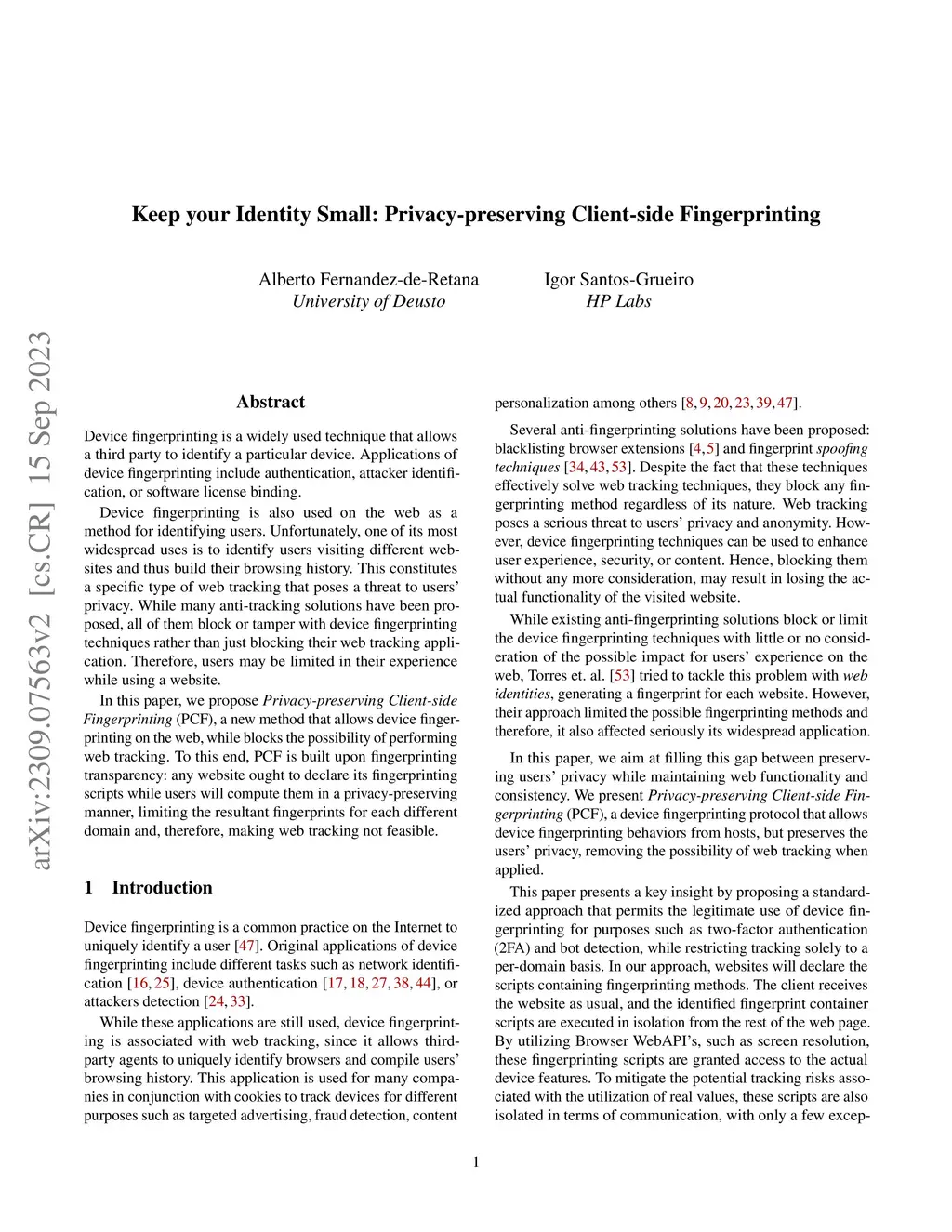 Keep your Identity Small: Privacy-preserving Client-side Fingerprinting