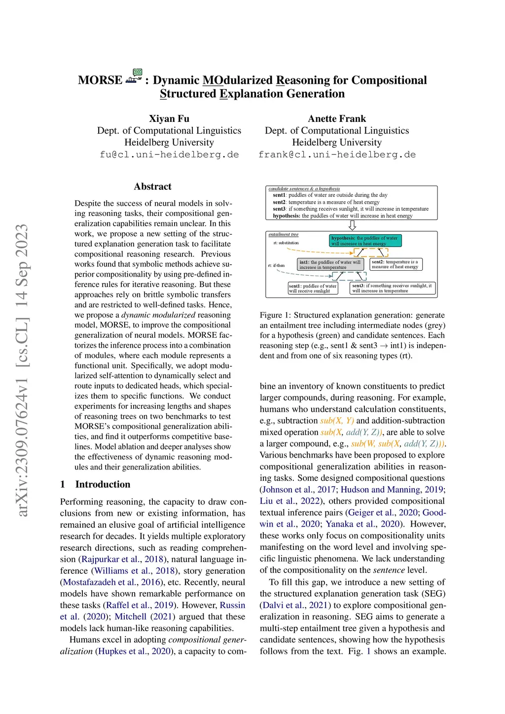Despite the success of neural models in solving reasoning tasks, their compositional generalization capabilities remain unclear. In this work, we propose a new setting of the structured explanation generation task to facilitate compositional reasoning research. Previous works found that symbolic methods achieve superior compositionality by using pre-defined inference rules for iterative reasoning. But these approaches rely on brittle symbolic transfers and are restricted to well-defined tasks. Hence, we propose a dynamic modularized reasoning model, MORSE, to improve the compositional generalization of neural models. MORSE factorizes the inference process into a combination of modules, where each module represents a functional unit. Specifically, we adopt modularized self-attention to dynamically select and route inputs to dedicated heads, which specializes them to specific functions. We conduct experiments for increasing lengths and shapes of reasoning trees on two benchmarks to test MORSE's compositional generalization abilities, and find it outperforms competitive baselines. Model ablation and deeper analyses show the effectiveness of dynamic reasoning modules and their generalization abilities.
