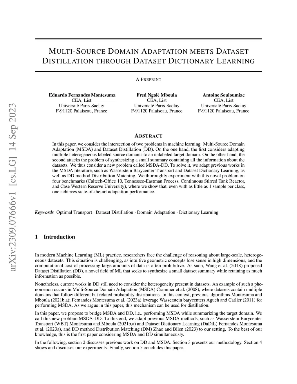 In this paper, we consider the intersection of two problems in machine learning: Multi-Source Domain Adaptation (MSDA) and Dataset Distillation (DD). On the one hand, the first considers adapting multiple heterogeneous labeled source domains to an unlabeled target domain. On the other hand, the second attacks the problem of synthesizing a small summary containing all the information about the datasets. We thus consider a new problem called MSDA-DD. To solve it, we adapt previous works in the MSDA literature, such as Wasserstein Barycenter Transport and Dataset Dictionary Learning, as well as DD method Distribution Matching. We thoroughly experiment with this novel problem on four benchmarks (Caltech-Office 10, Tennessee-Eastman Process, Continuous Stirred Tank Reactor, and Case Western Reserve University), where we show that, even with as little as 1 sample per class, one achieves state-of-the-art adaptation performance.