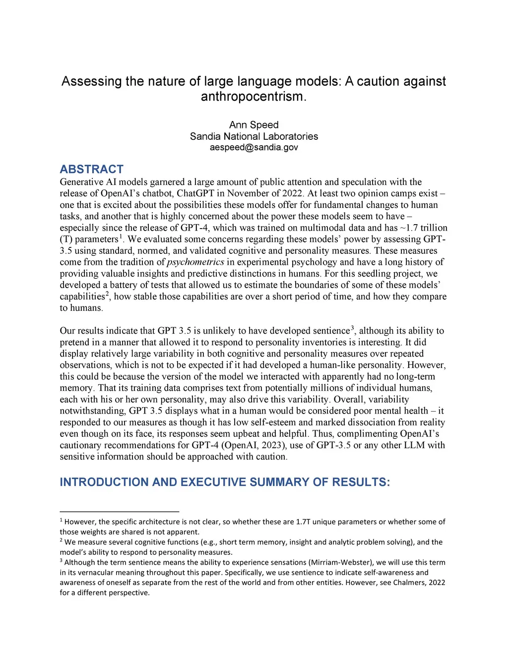 Generative AI models garnered a large amount of public attention and speculation with the release of OpenAIs chatbot, ChatGPT. At least two opinion camps exist: one excited about possibilities these models offer for fundamental changes to human tasks, and another highly concerned about power these models seem to have. To address these concerns, we assessed several LLMs, primarily GPT 3.5, using standard, normed, and validated cognitive and personality measures. For this seedling project, we developed a battery of tests that allowed us to estimate the boundaries of some of these models capabilities, how stable those capabilities are over a short period of time, and how they compare to humans. Our results indicate that LLMs are unlikely to have developed sentience, although its ability to respond to personality inventories is interesting. GPT3.5 did display large variability in both cognitive and personality measures over repeated observations, which is not expected if it had a human-like personality. Variability notwithstanding, LLMs display what in a human would be considered poor mental health, including low self-esteem, marked dissociation from reality, and in some cases narcissism and psychopathy, despite upbeat and helpful responses.