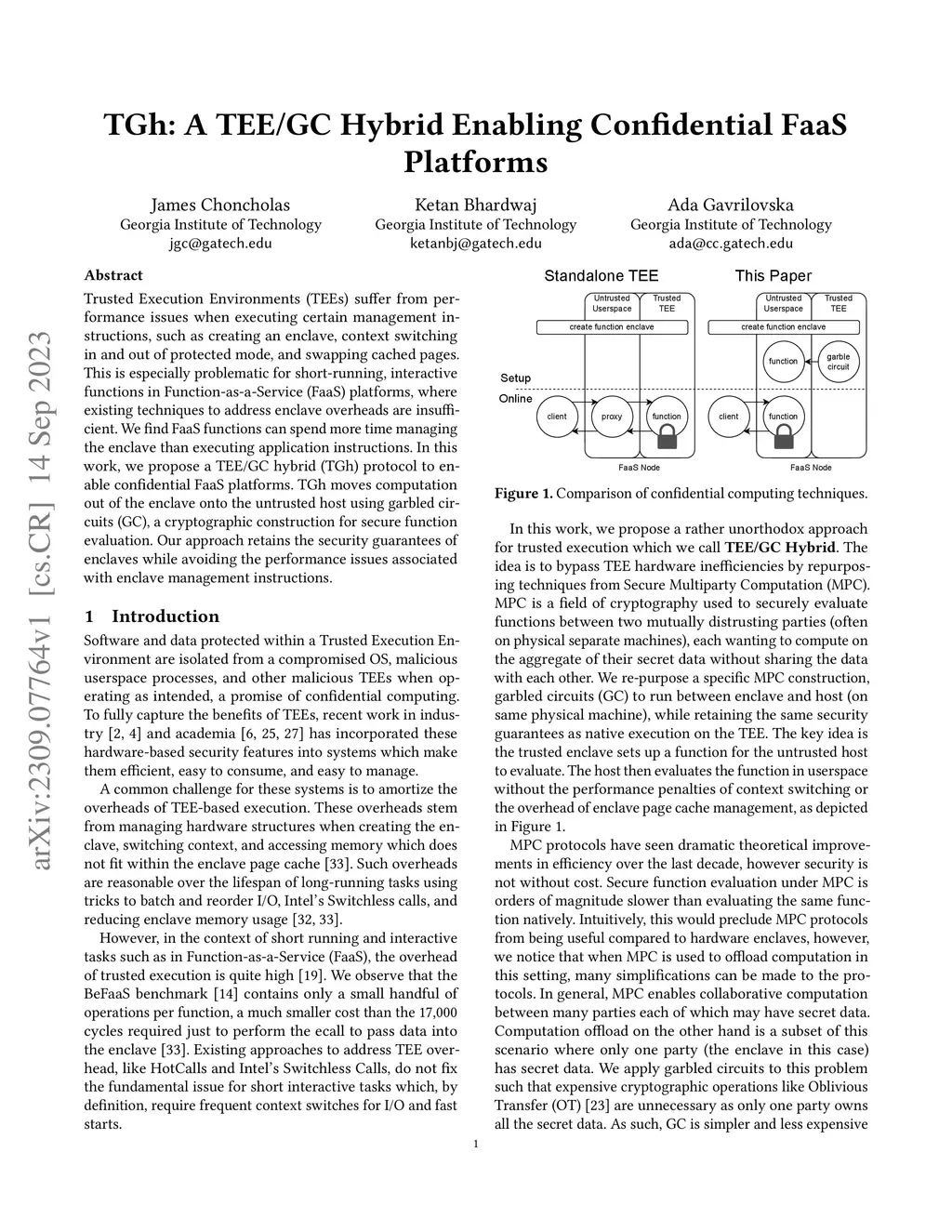 Trusted Execution Environments (TEEs) suffer from performance issues when executing certain management instructions, such as creating an enclave, context switching in and out of protected mode, and swapping cached pages. This is especially problematic for short-running, interactive functions in Function-as-a-Service (FaaS) platforms, where existing techniques to address enclave overheads are insufficient. We find FaaS functions can spend more time managing the enclave than executing application instructions. In this work, we propose a TEE/GC hybrid (TGh) protocol to enable confidential FaaS platforms. TGh moves computation out of the enclave onto the untrusted host using garbled circuits (GC), a cryptographic construction for secure function evaluation. Our approach retains the security guarantees of enclaves while avoiding the performance issues associated with enclave management instructions.