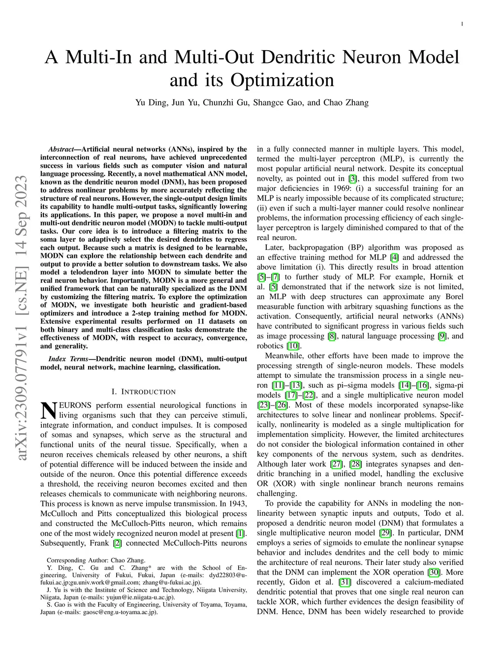 A Multi-In and Multi-Out Dendritic Neuron Model and its Optimization