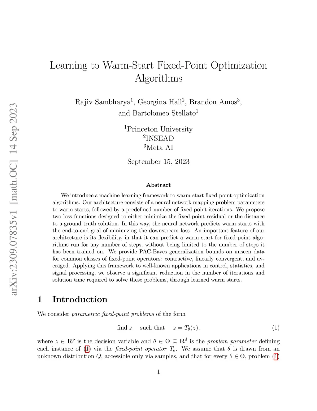 We introduce a machine-learning framework to warm-start fixed-point optimization algorithms. Our architecture consists of a neural network mapping problem parameters to warm starts, followed by a predefined number of fixed-point iterations. We propose two loss functions designed to either minimize the fixed-point residual or the distance to a ground truth solution. In this way, the neural network predicts warm starts with the end-to-end goal of minimizing the downstream loss. An important feature of our architecture is its flexibility, in that it can predict a warm start for fixed-point algorithms run for any number of steps, without being limited to the number of steps it has been trained on. We provide PAC-Bayes generalization bounds on unseen data for common classes of fixed-point operators: contractive, linearly convergent, and averaged. Applying this framework to well-known applications in control, statistics, and signal processing, we observe a significant reduction in the number of iterations and solution time required to solve these problems, through learned warm starts.