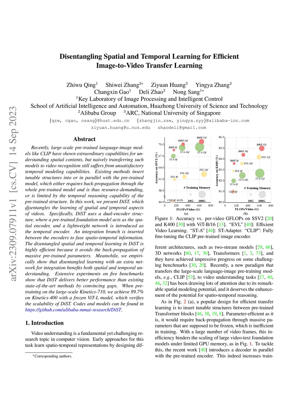 Recently, large-scale pre-trained language-image models like CLIP have shown extraordinary capabilities for understanding spatial contents, but naively transferring such models to video recognition still suffers from unsatisfactory temporal modeling capabilities. Existing methods insert tunable structures into or in parallel with the pre-trained model, which either requires back-propagation through the whole pre-trained model and is thus resource-demanding, or is limited by the temporal reasoning capability of the pre-trained structure. In this work, we present DiST, which disentangles the learning of spatial and temporal aspects of videos. Specifically, DiST uses a dual-encoder structure, where a pre-trained foundation model acts as the spatial encoder, and a lightweight network is introduced as the temporal encoder. An integration branch is inserted between the encoders to fuse spatio-temporal information. The disentangled spatial and temporal learning in DiST is highly efficient because it avoids the back-propagation of massive pre-trained parameters. Meanwhile, we empirically show that disentangled learning with an extra network for integration benefits both spatial and temporal understanding. Extensive experiments on five benchmarks show that DiST delivers better performance than existing state-of-the-art methods by convincing gaps. When pre-training on the large-scale Kinetics-710, we achieve 89.7% on Kinetics-400 with a frozen ViT-L model, which verifies the scalability of DiST. Codes and models can be found in https://github.com/alibaba-mmai-research/DiST.