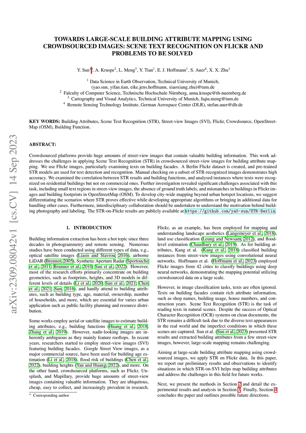 Crowdsourced platforms provide huge amounts of street-view images that contain valuable building information. This work addresses the challenges in applying Scene Text Recognition (STR) in crowdsourced street-view images for building attribute mapping. We use Flickr images, particularly examining texts on building facades. A Berlin Flickr dataset is created, and pre-trained STR models are used for text detection and recognition. Manual checking on a subset of STR-recognized images demonstrates high accuracy. We examined the correlation between STR results and building functions, and analysed instances where texts were recognized on residential buildings but not on commercial ones. Further investigation revealed significant challenges associated with this task, including small text regions in street-view images, the absence of ground truth labels, and mismatches in buildings in Flickr images and building footprints in OpenStreetMap (OSM). To develop city-wide mapping beyond urban hotspot locations, we suggest differentiating the scenarios where STR proves effective while developing appropriate algorithms or bringing in additional data for handling other cases. Furthermore, interdisciplinary collaboration should be undertaken to understand the motivation behind building photography and labeling. The STR-on-Flickr results are publicly available at https://github.com/ya0-sun/STR-Berlin.