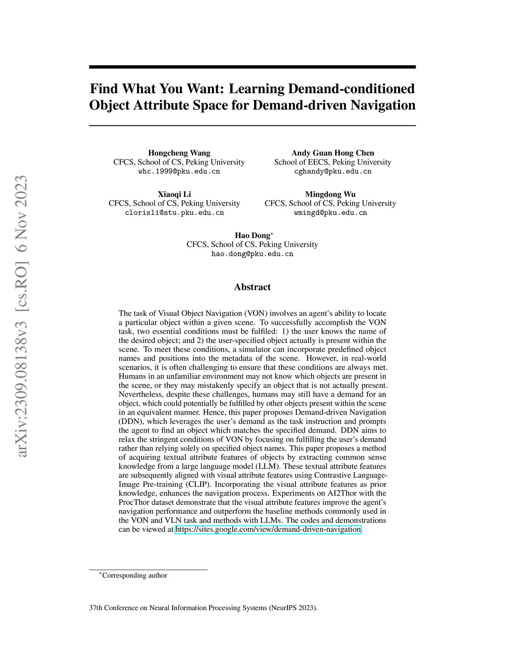 The task of Visual Object Navigation (VON) involves an agent's ability to locate a particular object within a given scene. In order to successfully accomplish the VON task, two essential conditions must be fulfilled:1) the user must know the name of the desired object; and 2) the user-specified object must actually be present within the scene. To meet these conditions, a simulator can incorporate pre-defined object names and positions into the metadata of the scene. However, in real-world scenarios, it is often challenging to ensure that these conditions are always met. Human in an unfamiliar environment may not know which objects are present in the scene, or they may mistakenly specify an object that is not actually present. Nevertheless, despite these challenges, human may still have a demand for an object, which could potentially be fulfilled by other objects present within the scene in an equivalent manner. Hence, we propose Demand-driven Navigation (DDN), which leverages the user's demand as the task instruction and prompts the agent to find the object matches the specified demand. DDN aims to relax the stringent conditions of VON by focusing on fulfilling the user's demand rather than relying solely on predefined object categories or names. We propose a method first acquire textual attribute features of objects by extracting common knowledge from a large language model. These textual attribute features are subsequently aligned with visual attribute features using Contrastive Language-Image Pre-training (CLIP). By incorporating the visual attribute features as prior knowledge, we enhance the navigation process. Experiments on AI2Thor with the ProcThor dataset demonstrate the visual attribute features improve the agent's navigation performance and outperform the baseline methods commonly used in VON.