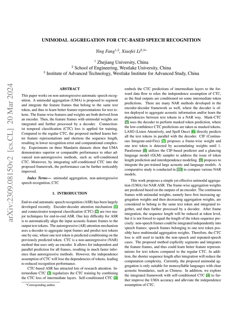 This paper works on non-autoregressive automatic speech recognition. A unimodal aggregation (UMA) is proposed to segment and integrate the feature frames that belong to the same text token, and thus to learn better feature representations for text tokens. The frame-wise features and weights are both derived from an encoder. Then, the feature frames with unimodal weights are integrated and further processed by a decoder. Connectionist temporal classification (CTC) loss is applied for training. Compared to the regular CTC, the proposed method learns better feature representations and shortens the sequence length, resulting in lower recognition error and computational complexity. Experiments on three Mandarin datasets show that UMA demonstrates superior or comparable performance to other advanced non-autoregressive methods, such as self-conditioned CTC. Moreover, by integrating self-conditioned CTC into the proposed framework, the performance can be further noticeably improved.