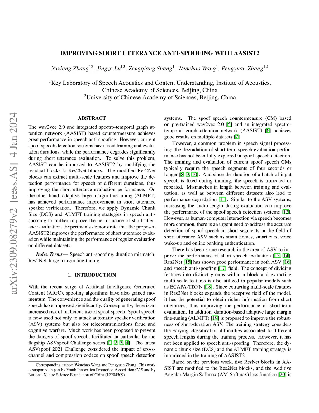 The wav2vec 2.0 and integrated spectro-temporal graph attention network (AASIST) based countermeasure achieves great performance in speech anti-spoofing. However, current spoof speech detection systems have fixed training and evaluation durations, while the performance degrades significantly during short utterance evaluation. To solve this problem, AASIST can be improved to AASIST2 by modifying the residual blocks to Res2Net blocks. The modified Res2Net blocks can extract multi-scale features and improve the detection performance for speech of different durations, thus improving the short utterance evaluation performance. On the other hand, adaptive large margin fine-tuning (ALMFT) has achieved performance improvement in short utterance speaker verification. Therefore, we apply Dynamic Chunk Size (DCS) and ALMFT training strategies in speech anti-spoofing to further improve the performance of short utterance evaluation. Experiments demonstrate that the proposed AASIST2 improves the performance of short utterance evaluation while maintaining the performance of regular evaluation on different datasets.