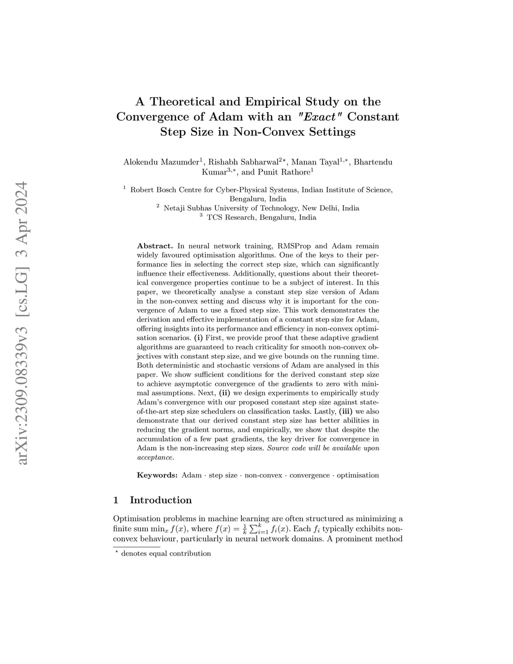 In neural network training, RMSProp and Adam remain widely favoured optimisation algorithms. One of the keys to their performance lies in selecting the correct step size, which can significantly influence their effectiveness. Additionally, questions about their theoretical convergence properties continue to be a subject of interest. In this paper, we theoretically analyse a constant step size version of Adam in the non-convex setting and discuss why it is important for the convergence of Adam to use a fixed step size. This work demonstrates the derivation and effective implementation of a constant step size for Adam, offering insights into its performance and efficiency in non convex optimisation scenarios. (i) First, we provide proof that these adaptive gradient algorithms are guaranteed to reach criticality for smooth non-convex objectives with constant step size, and we give bounds on the running time. Both deterministic and stochastic versions of Adam are analysed in this paper. We show sufficient conditions for the derived constant step size to achieve asymptotic convergence of the gradients to zero with minimal assumptions. Next, (ii) we design experiments to empirically study Adam's convergence with our proposed constant step size against stateof the art step size schedulers on classification tasks. Lastly, (iii) we also demonstrate that our derived constant step size has better abilities in reducing the gradient norms, and empirically, we show that despite the accumulation of a few past gradients, the key driver for convergence in Adam is the non-increasing step sizes.