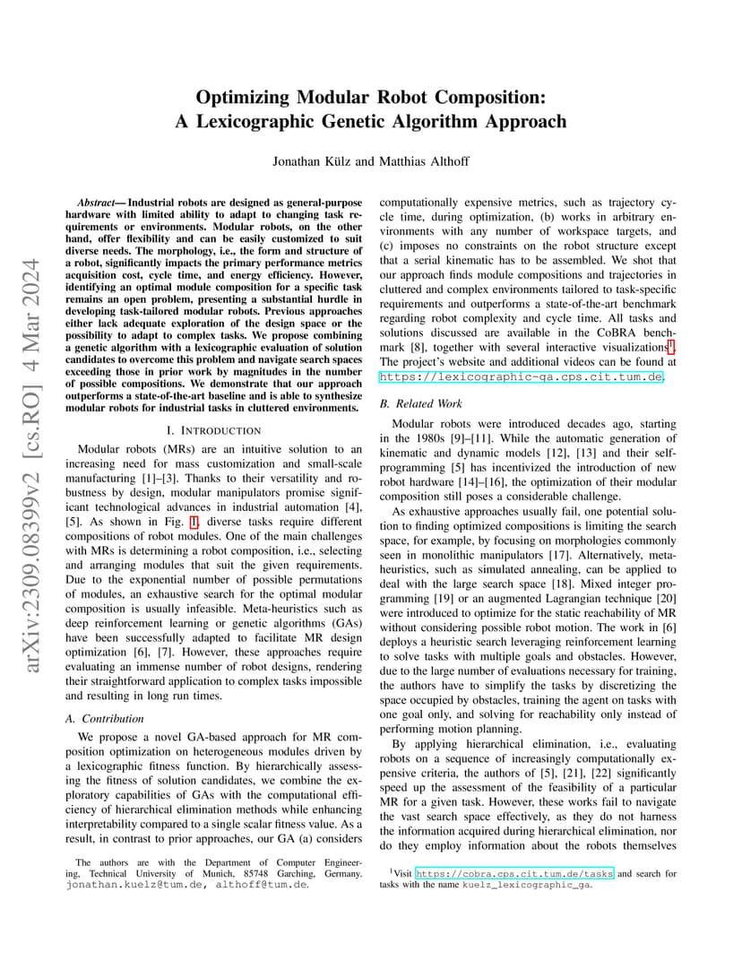 Industrial robots are designed as general-purpose hardware with limited ability to adapt to changing task requirements or environments. Modular robots, on the other hand, offer flexibility and can be easily customized to suit diverse needs. The morphology, i.e., the form and structure of a robot, significantly impacts the primary performance metrics acquisition cost, cycle time, and energy efficiency. However, identifying an optimal module composition for a specific task remains an open problem, presenting a substantial hurdle in developing task-tailored modular robots. Previous approaches either lack adequate exploration of the design space or the possibility to adapt to complex tasks. We propose combining a genetic algorithm with a lexicographic evaluation of solution candidates to overcome this problem and navigate search spaces exceeding those in prior work by magnitudes in the number of possible compositions. We demonstrate that our approach outperforms a state-of-the-art baseline and is able to synthesize modular robots for industrial tasks in cluttered environments.