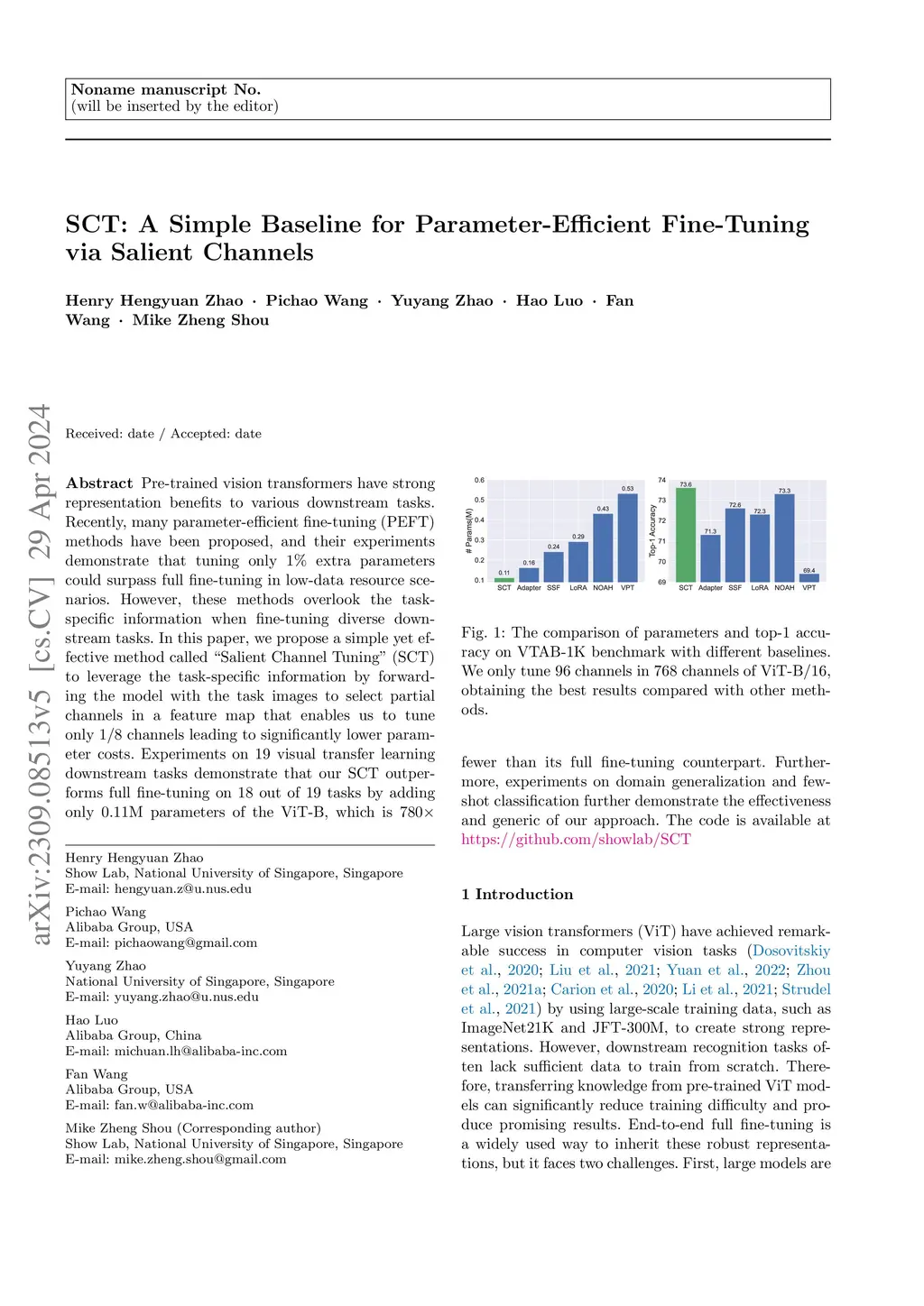 Pre-trained vision transformers have strong representation benefits to various downstream tasks. Recently, many parameter-efficient fine-tuning (PEFT) methods have been proposed, and their experiments demonstrate that tuning only 1\% extra parameters could surpass full fine-tuning in low-data resource scenarios. However, these methods overlook the task-specific information when fine-tuning diverse downstream tasks. In this paper, we propose a simple yet effective method called "Salient Channel Tuning" (SCT) to leverage the task-specific information by forwarding the model with the task images to select partial channels in a feature map that enables us to tune only 1/8 channels leading to significantly lower parameter costs. Experiments on 19 visual transfer learning downstream tasks demonstrate that our SCT outperforms full fine-tuning on 18 out of 19 tasks by adding only 0.11M parameters of the ViT-B, which is 780 fewer than its full fine-tuning counterpart. Furthermore, experiments on domain generalization and few-shot classification further demonstrate the effectiveness and generic of our approach. The code is available at https://github.com/showlab/SCT.