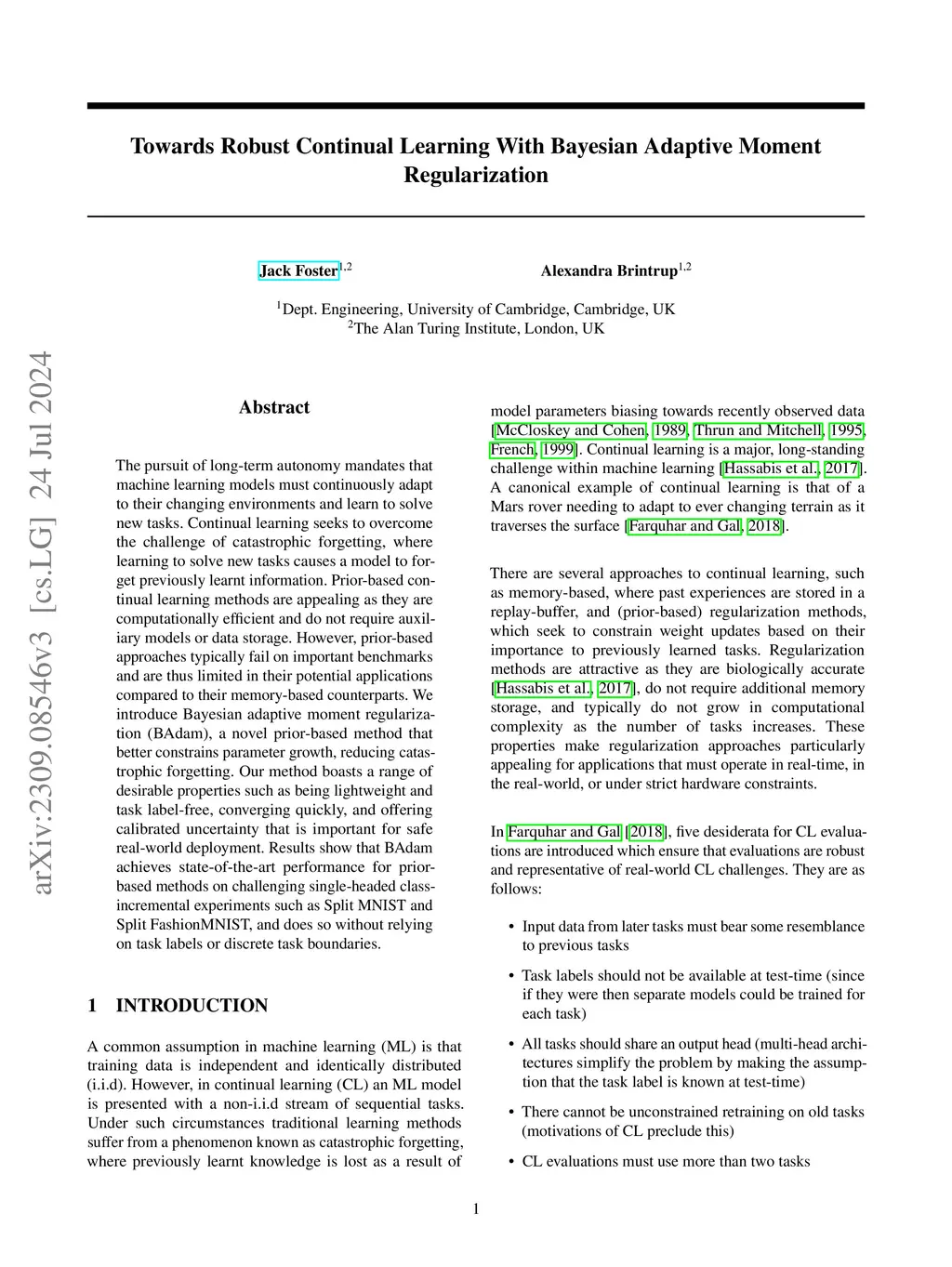 The pursuit of long-term autonomy mandates that robotic agents must continuously adapt to their changing environments and learn to solve new tasks. Continual learning seeks to overcome the challenge of catastrophic forgetting, where learning to solve new tasks causes a model to forget previously learnt information. Prior-based continual learning methods are appealing for robotic applications as they are space efficient and typically do not increase in computational complexity as the number of tasks grows. Despite these desirable properties, prior-based approaches typically fail on important benchmarks and consequently are limited in their potential applications compared to their memory-based counterparts. We introduce Bayesian adaptive moment regularization (BAdam), a novel prior-based method that better constrains parameter growth, leading to lower catastrophic forgetting. Our method boasts a range of desirable properties for robotic applications such as being lightweight and task label-free, converging quickly, and offering calibrated uncertainty that is important for safe real-world deployment. Results show that BAdam achieves state-of-the-art performance for prior-based methods on challenging single-headed class-incremental experiments such as Split MNIST and Split FashionMNIST, and does so without relying on task labels or discrete task boundaries.