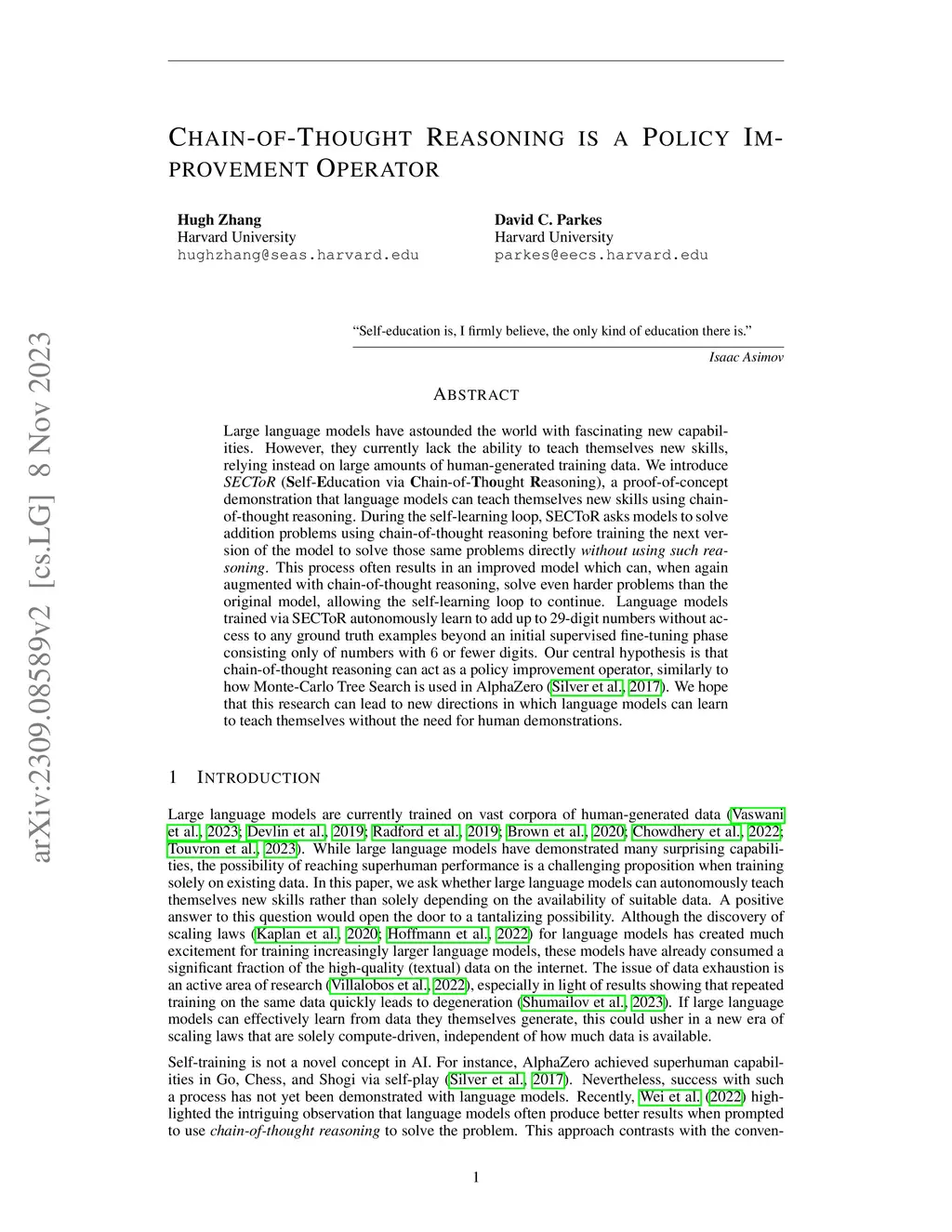 Large language models have astounded the world with fascinating new capabilities. However, they currently lack the ability to teach themselves new skills, relying instead on large amounts of human-generated training data. We introduce SECToR (Self-Education via Chain-of-Thought Reasoning), a proof-of-concept demonstration that language models can teach themselves new skills using chain-of-thought reasoning. During the self-learning loop, SECToR asks models to solve addition problems using chain-of-thought reasoning before training the next version of the model to solve those same problems directly without using such reasoning. This process often results in an improved model which can, when again augmented with chain-of-thought reasoning, solve even harder problems than the original model, allowing the self-learning loop to continue. Language models trained via SECToR autonomously learn to add up to the longest-length-digit numbers without access to any ground truth examples beyond an initial supervised fine-tuning phase consisting only of numbers with 6 or fewer digits. Our central hypothesis is that chain-of-thought reasoning can act as a policy improvement operator, similarly to how Monte-Carlo Tree Search is used in AlphaZero (Silver et al., 2017). We hope that this research can lead to new directions in which language models can learn to teach themselves without the need for human demonstrations.