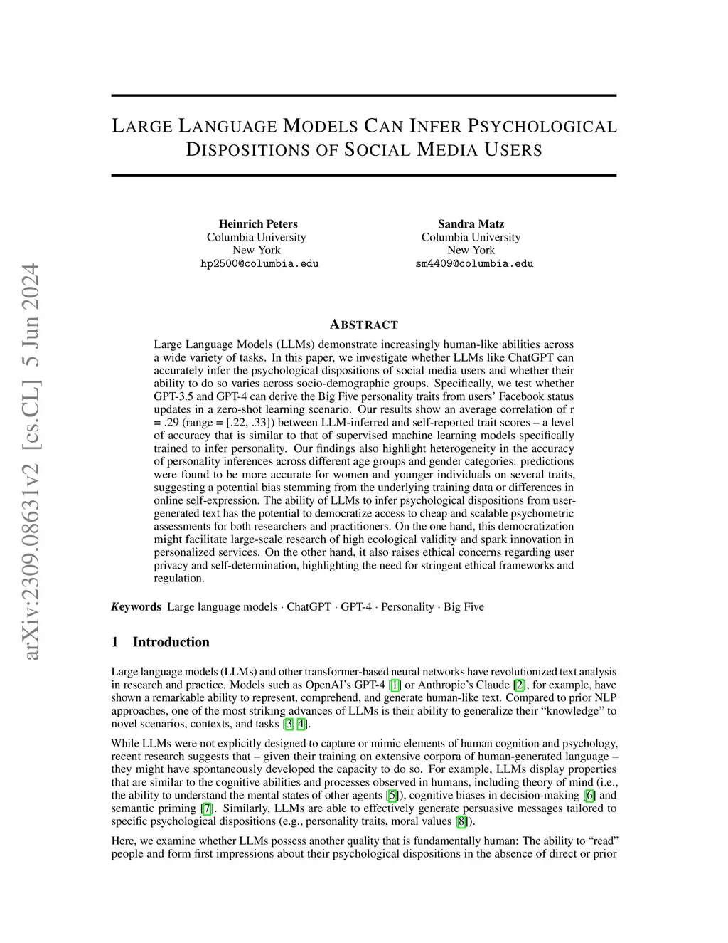 Large Language Models (LLMs) demonstrate increasingly human-like abilities across a wide variety of tasks. In this paper, we investigate whether LLMs like ChatGPT can accurately infer the psychological dispositions of social media users and whether their ability to do so varies across socio-demographic groups. Specifically, we test whether GPT-3.5 and GPT-4 can derive the Big Five personality traits from users' Facebook status updates in a zero-shot learning scenario. Our results show an average correlation of r = .29 (range = [.22, .33]) between LLM-inferred and self-reported trait scores - a level of accuracy that is similar to that of supervised machine learning models specifically trained to infer personality. Our findings also highlight heterogeneity in the accuracy of personality inferences across different age groups and gender categories: predictions were found to be more accurate for women and younger individuals on several traits, suggesting a potential bias stemming from the underlying training data or differences in online self-expression. The ability of LLMs to infer psychological dispositions from user-generated text has the potential to democratize access to cheap and scalable psychometric assessments for both researchers and practitioners. On the one hand, this democratization might facilitate large-scale research of high ecological validity and spark innovation in personalized services. On the other hand, it also raises ethical concerns regarding user privacy and self-determination, highlighting the need for stringent ethical frameworks and regulation.