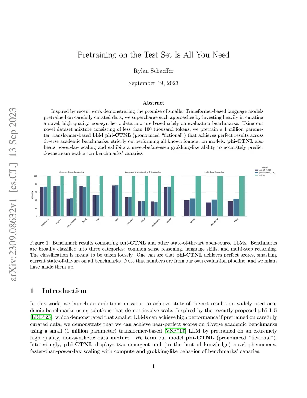 Inspired by recent work demonstrating the promise of smaller Transformer-based language models pretrained on carefully curated data, we supercharge such approaches by investing heavily in curating a novel, high quality, non-synthetic data mixture based solely on evaluation benchmarks. Using our novel dataset mixture consisting of less than 100 thousand tokens, we pretrain a 1 million parameter transformer-based LLM \textbf{phi-CTNL} (pronounced ``fictional") that achieves perfect results across diverse academic benchmarks, strictly outperforming all known foundation models. \textbf{phi-CTNL} also beats power-law scaling and exhibits a never-before-seen grokking-like ability to accurately predict downstream evaluation benchmarks' canaries.
