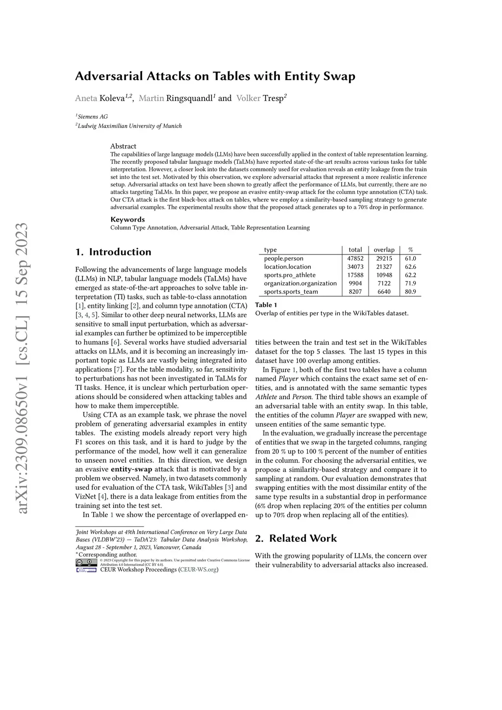 Adversarial Attacks on Tables with Entity Swap