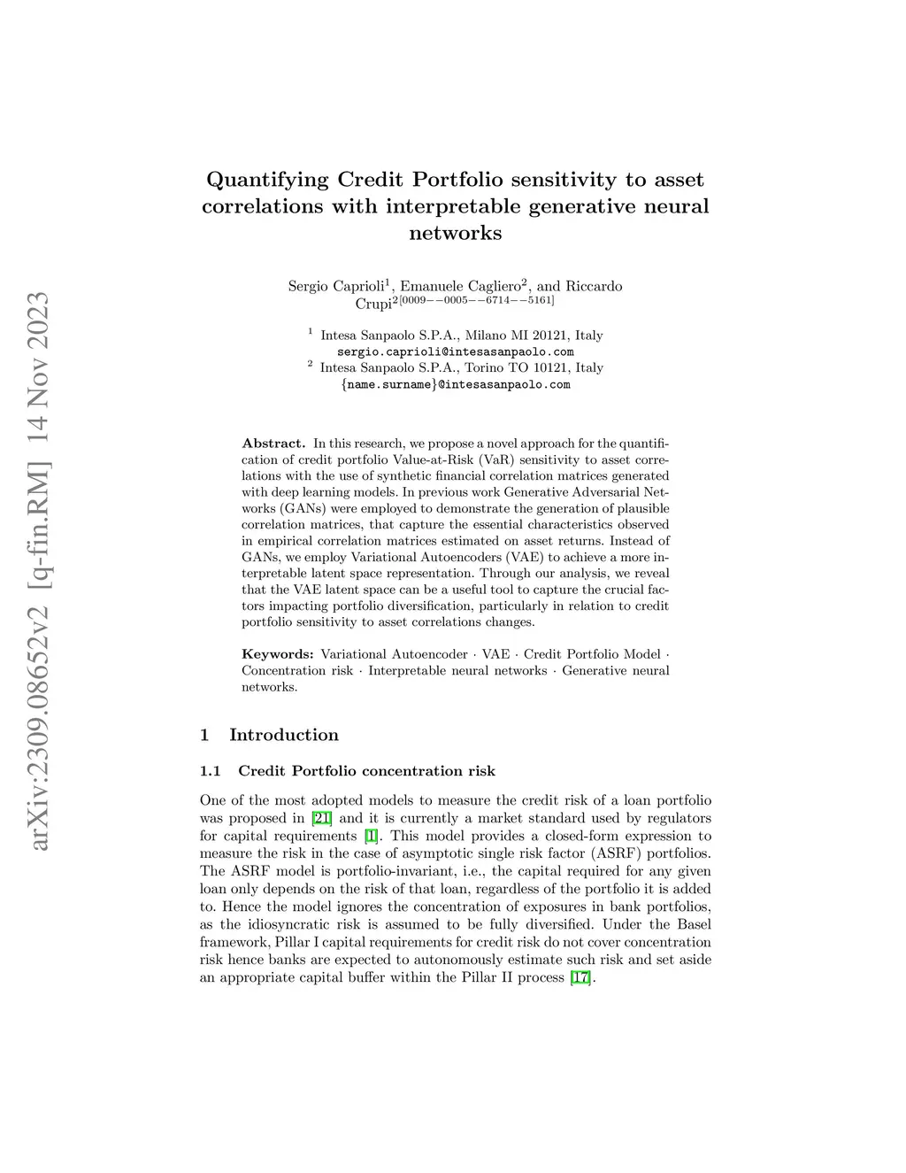 In this research, we propose a novel approach for the quantification of credit portfolio Value-at-Risk (VaR) sensitivity to asset correlations with the use of synthetic financial correlation matrices generated with deep learning models. In previous work Generative Adversarial Networks (GANs) were employed to demonstrate the generation of plausible correlation matrices, that capture the essential characteristics observed in empirical correlation matrices estimated on asset returns. Instead of GANs, we employ Variational Autoencoders (VAE) to achieve a more interpretable latent space representation. Through our analysis, we reveal that the VAE latent space can be a useful tool to capture the crucial factors impacting portfolio diversification, particularly in relation to credit portfolio sensitivity to asset correlations changes.