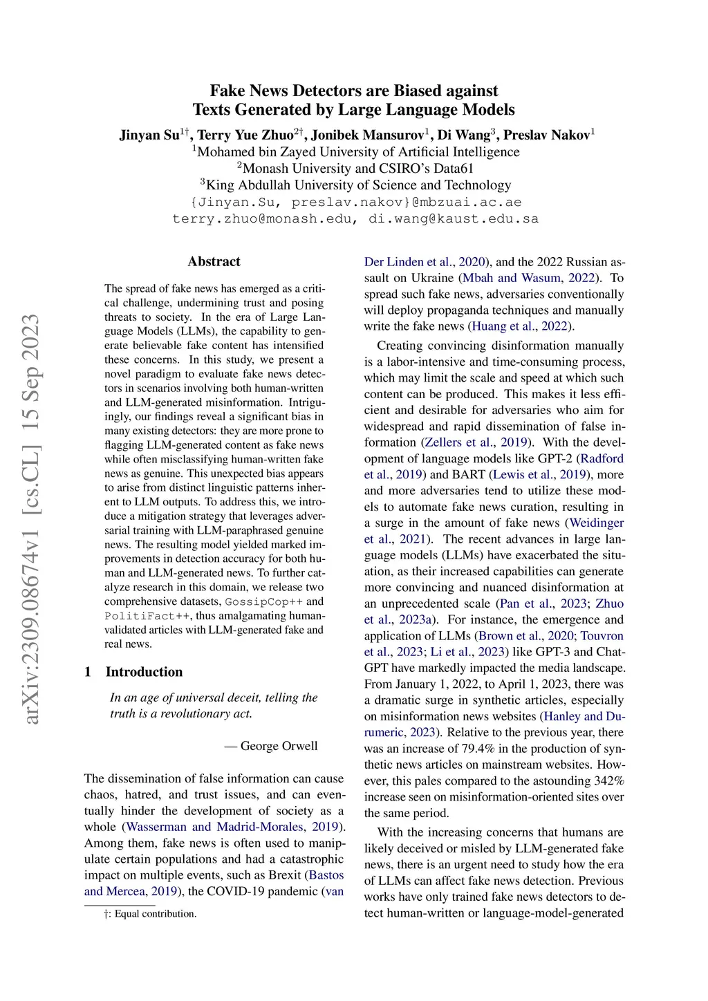 Fake News Detectors are Biased against Texts Generated by Large Language