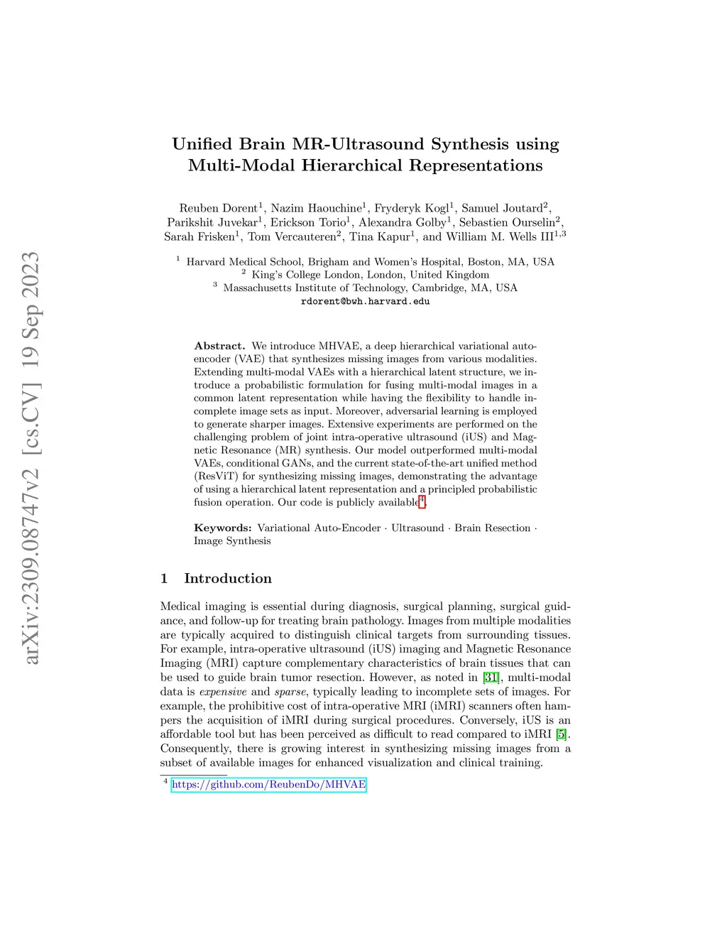 We introduce MHVAE, a deep hierarchical variational auto-encoder (VAE) that synthesizes missing images from various modalities. Extending multi-modal VAEs with a hierarchical latent structure, we introduce a probabilistic formulation for fusing multi-modal images in a common latent representation while having the flexibility to handle incomplete image sets as input. Moreover, adversarial learning is employed to generate sharper images. Extensive experiments are performed on the challenging problem of joint intra-operative ultrasound (iUS) and Magnetic Resonance (MR) synthesis. Our model outperformed multi-modal VAEs, conditional GANs, and the current state-of-the-art unified method (ResViT) for synthesizing missing images, demonstrating the advantage of using a hierarchical latent representation and a principled probabilistic fusion operation. Our code is publicly available \url{https://github.com/ReubenDo/MHVAE}.