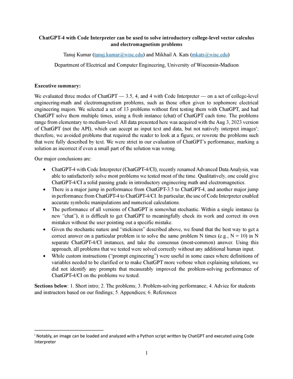 We evaluated ChatGPT 3.5, 4, and 4 with Code Interpreter on a set of college-level engineering-math and electromagnetism problems, such as those often given to sophomore electrical engineering majors. We selected a set of 13 problems, and had ChatGPT solve them multiple times, using a fresh instance (chat) each time. We found that ChatGPT-4 with Code Interpreter was able to satisfactorily solve most problems we tested most of the time -- a major improvement over the performance of ChatGPT-4 (or 3.5) without Code Interpreter. The performance of ChatGPT was observed to be somewhat stochastic, and we found that solving the same problem N times in new ChatGPT instances and taking the most-common answer was an effective strategy. Based on our findings and observations, we provide some recommendations for instructors and students of classes at this level.