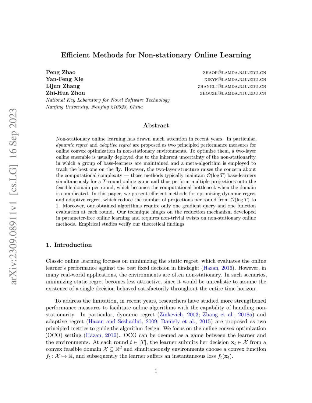 Non-stationary online learning has drawn much attention in recent years. In particular, dynamic regret and adaptive regret are proposed as two principled performance measures for online convex optimization in non-stationary environments. To optimize them, a two-layer online ensemble is usually deployed due to the inherent uncertainty of non-stationarity, in which multiple base-learners are maintained and a meta-algorithm is employed to track the best one on the fly. However, the two-layer structure raises concerns about computational complexity -- such methods typically maintain base-learners simultaneously for a -round online game and thus perform multiple projections onto the feasible domain per round, which becomes the computational bottleneck when the domain is complicated. In this paper, we present efficient methods for optimizing dynamic regret and adaptive regret that reduce the number of projections per round from to . The proposed algorithms require only one gradient query and one function evaluation at each round. Our technique hinges on the reduction mechanism developed in parameter-free online learning and requires non-trivial modifications for non-stationary online methods. Furthermore, we study an even stronger measure, namely "interval dynamic regret", and reduce the number of projections per round from to for minimizing it. Our reduction demonstrates broad generality and applies to two important applications: online stochastic control and online principal component analysis, resulting in methods that are both efficient and optimal. Finally, empirical studies verify our theoretical findings.