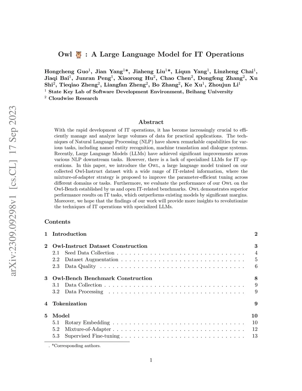 With the rapid development of IT operations, it has become increasingly crucial to efficiently manage and analyze large volumes of data for practical applications. The techniques of Natural Language Processing (NLP) have shown remarkable capabilities for various tasks, including named entity recognition, machine translation and dialogue systems. Recently, Large Language Models (LLMs) have achieved significant improvements across various NLP downstream tasks. However, there is a lack of specialized LLMs for IT operations. In this paper, we introduce the OWL, a large language model trained on our collected OWL-Instruct dataset with a wide range of IT-related information, where the mixture-of-adapter strategy is proposed to improve the parameter-efficient tuning across different domains or tasks. Furthermore, we evaluate the performance of our OWL on the OWL-Bench established by us and open IT-related benchmarks. OWL demonstrates superior performance results on IT tasks, which outperforms existing models by significant margins. Moreover, we hope that the findings of our work will provide more insights to revolutionize the techniques of IT operations with specialized LLMs.