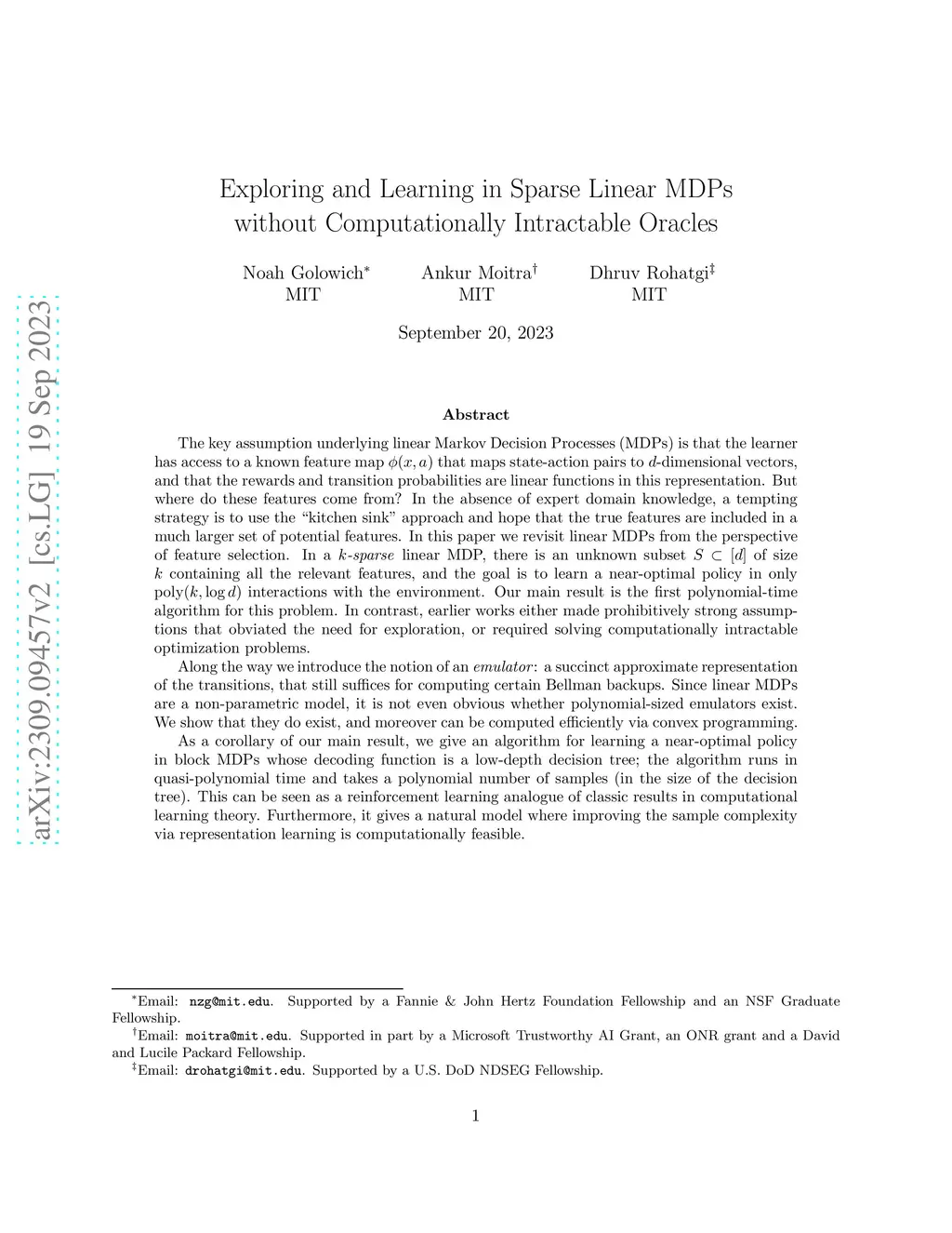 The key assumption underlying linear Markov Decision Processes (MDPs) is that the learner has access to a known feature map that maps state-action pairs to -dimensional vectors, and that the rewards and transitions are linear functions in this representation. But where do these features come from? In the absence of expert domain knowledge, a tempting strategy is to use the ``kitchen sink" approach and hope that the true features are included in a much larger set of potential features. In this paper we revisit linear MDPs from the perspective of feature selection. In a -sparse linear MDP, there is an unknown subset of size containing all the relevant features, and the goal is to learn a near-optimal policy in only poly interactions with the environment. Our main result is the first polynomial-time algorithm for this problem. In contrast, earlier works either made prohibitively strong assumptions that obviated the need for exploration, or required solving computationally intractable optimization problems. Along the way we introduce the notion of an emulator: a succinct approximate representation of the transitions that suffices for computing certain Bellman backups. Since linear MDPs are a non-parametric model, it is not even obvious whether polynomial-sized emulators exist. We show that they do exist and can be computed efficiently via convex programming. As a corollary of our main result, we give an algorithm for learning a near-optimal policy in block MDPs whose decoding function is a low-depth decision tree; the algorithm runs in quasi-polynomial time and takes a polynomial number of samples. This can be seen as a reinforcement learning analogue of classic results in computational learning theory. Furthermore, it gives a natural model where improving the sample complexity via representation learning is computationally feasible.
