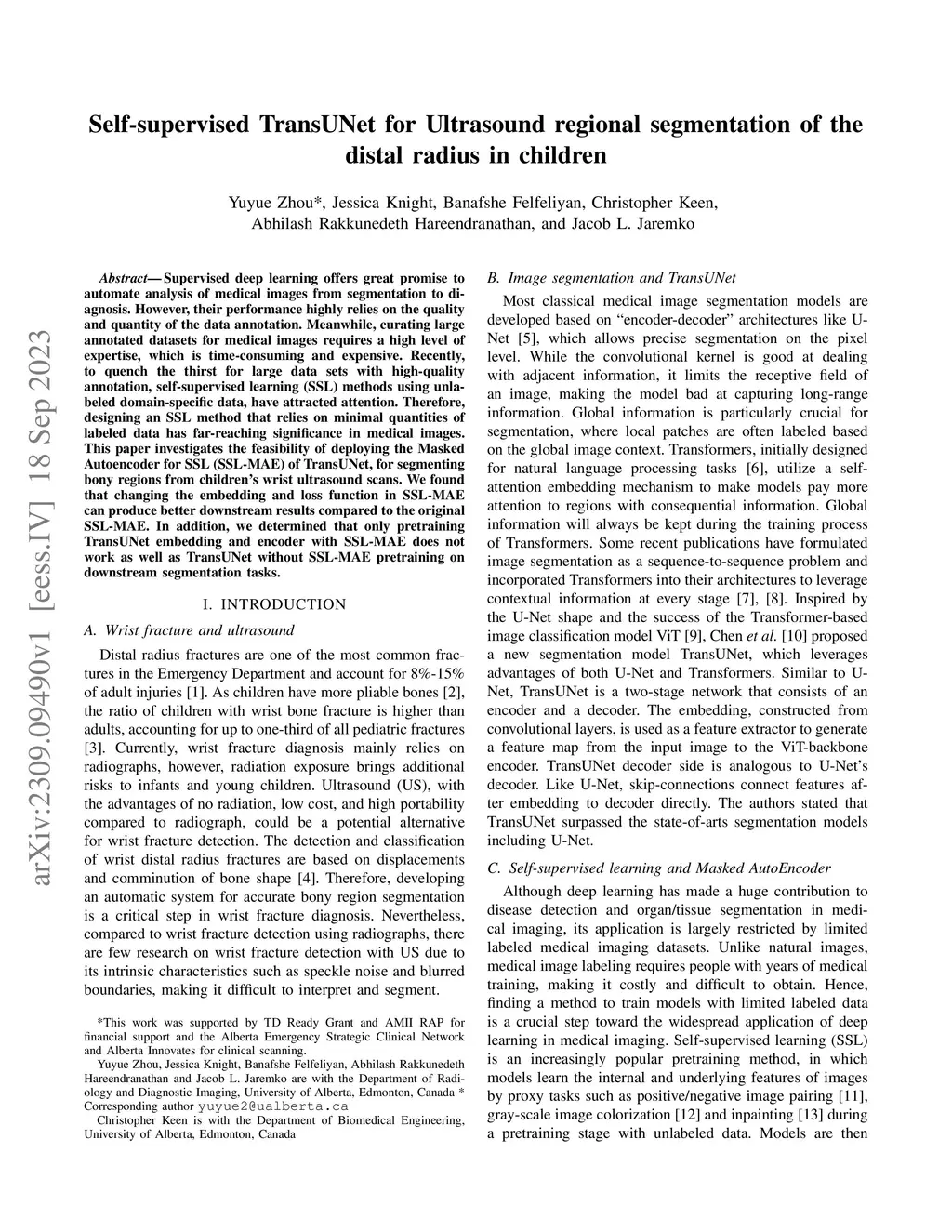 Self-supervised TransUNet for Ultrasound regional segmentation of the