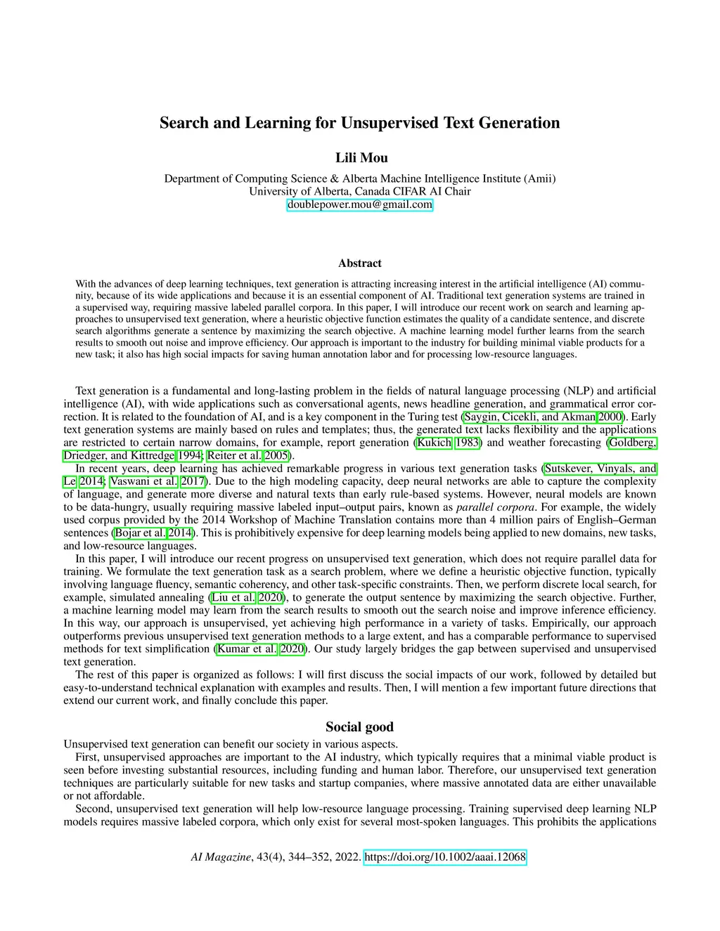 With the advances of deep learning techniques, text generation is attracting increasing interest in the artificial intelligence (AI) community, because of its wide applications and because it is an essential component of AI. Traditional text generation systems are trained in a supervised way, requiring massive labeled parallel corpora. In this paper, I will introduce our recent work on search and learning approaches to unsupervised text generation, where a heuristic objective function estimates the quality of a candidate sentence, and discrete search algorithms generate a sentence by maximizing the search objective. A machine learning model further learns from the search results to smooth out noise and improve efficiency. Our approach is important to the industry for building minimal viable products for a new task; it also has high social impacts for saving human annotation labor and for processing low-resource languages.
