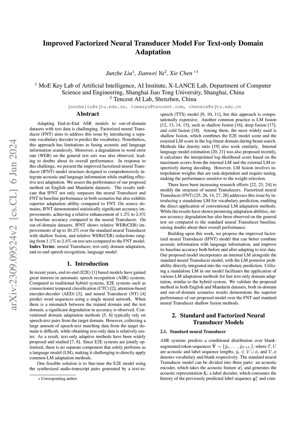 Adapting End-to-End ASR models to out-of-domain datasets with text data is challenging. Factorized neural Transducer (FNT) aims to address this issue by introducing a separate vocabulary decoder to predict the vocabulary. Nonetheless, this approach has limitations in fusing acoustic and language information seamlessly. Moreover, a degradation in word error rate (WER) on the general test sets was also observed, leading to doubts about its overall performance. In response to this challenge, we present the improved factorized neural Transducer (IFNT) model structure designed to comprehensively integrate acoustic and language information while enabling effective text adaptation. We assess the performance of our proposed method on English and Mandarin datasets. The results indicate that IFNT not only surpasses the neural Transducer and FNT in baseline performance in both scenarios but also exhibits superior adaptation ability compared to FNT. On source domains, IFNT demonstrated statistically significant accuracy improvements, achieving a relative enhancement of 1.2% to 2.8% in baseline accuracy compared to the neural Transducer. On out-of-domain datasets, IFNT shows relative WER(CER) improvements of up to 30.2% over the standard neural Transducer with shallow fusion, and relative WER(CER) reductions ranging from 1.1% to 2.8% on test sets compared to the FNT model.