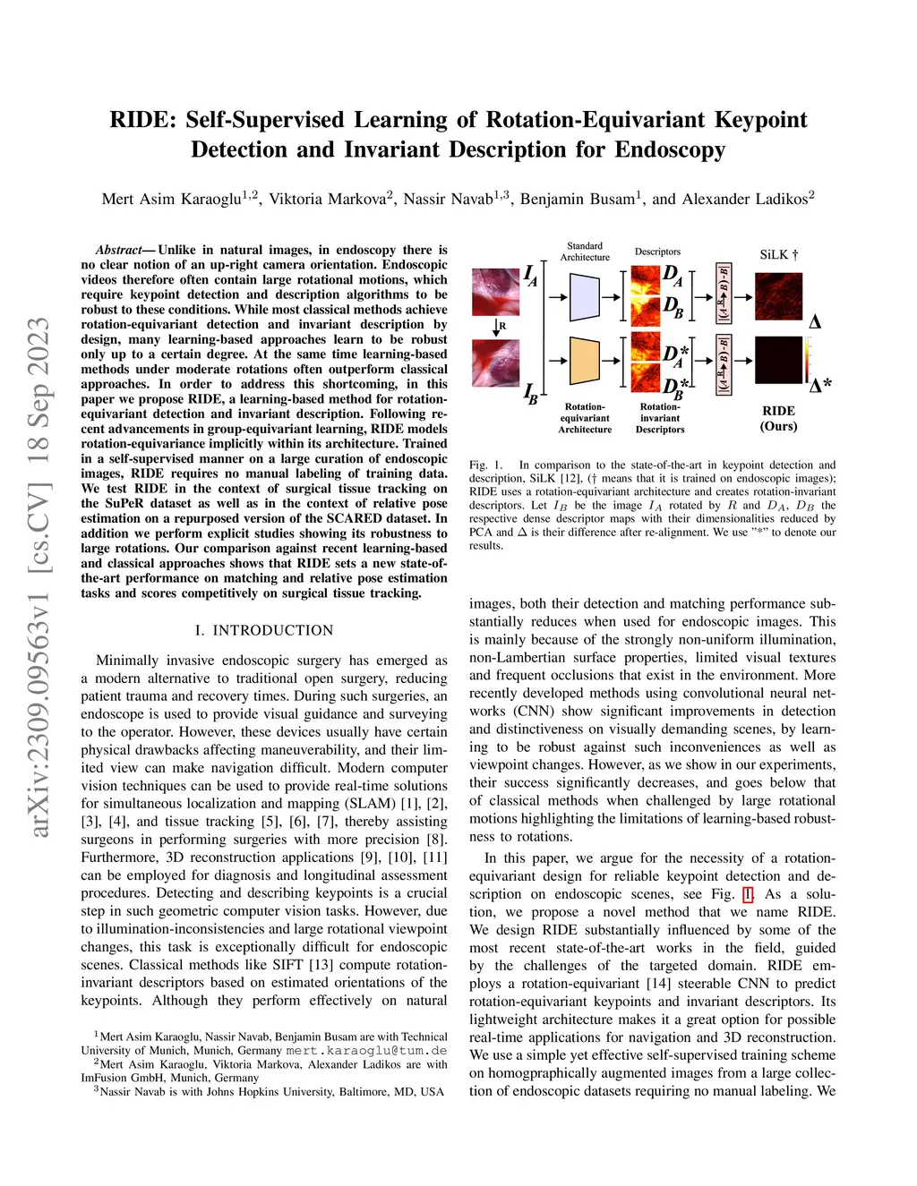 Unlike in natural images, in endoscopy there is no clear notion of an up-right camera orientation. Endoscopic videos therefore often contain large rotational motions, which require keypoint detection and description algorithms to be robust to these conditions. While most classical methods achieve rotation-equivariant detection and invariant description by design, many learning-based approaches learn to be robust only up to a certain degree. At the same time learning-based methods under moderate rotations often outperform classical approaches. In order to address this shortcoming, in this paper we propose RIDE, a learning-based method for rotation-equivariant detection and invariant description. Following recent advancements in group-equivariant learning, RIDE models rotation-equivariance implicitly within its architecture. Trained in a self-supervised manner on a large curation of endoscopic images, RIDE requires no manual labeling of training data. We test RIDE in the context of surgical tissue tracking on the SuPeR dataset as well as in the context of relative pose estimation on a repurposed version of the SCARED dataset. In addition we perform explicit studies showing its robustness to large rotations. Our comparison against recent learning-based and classical approaches shows that RIDE sets a new state-of-the-art performance on matching and relative pose estimation tasks and scores competitively on surgical tissue tracking.