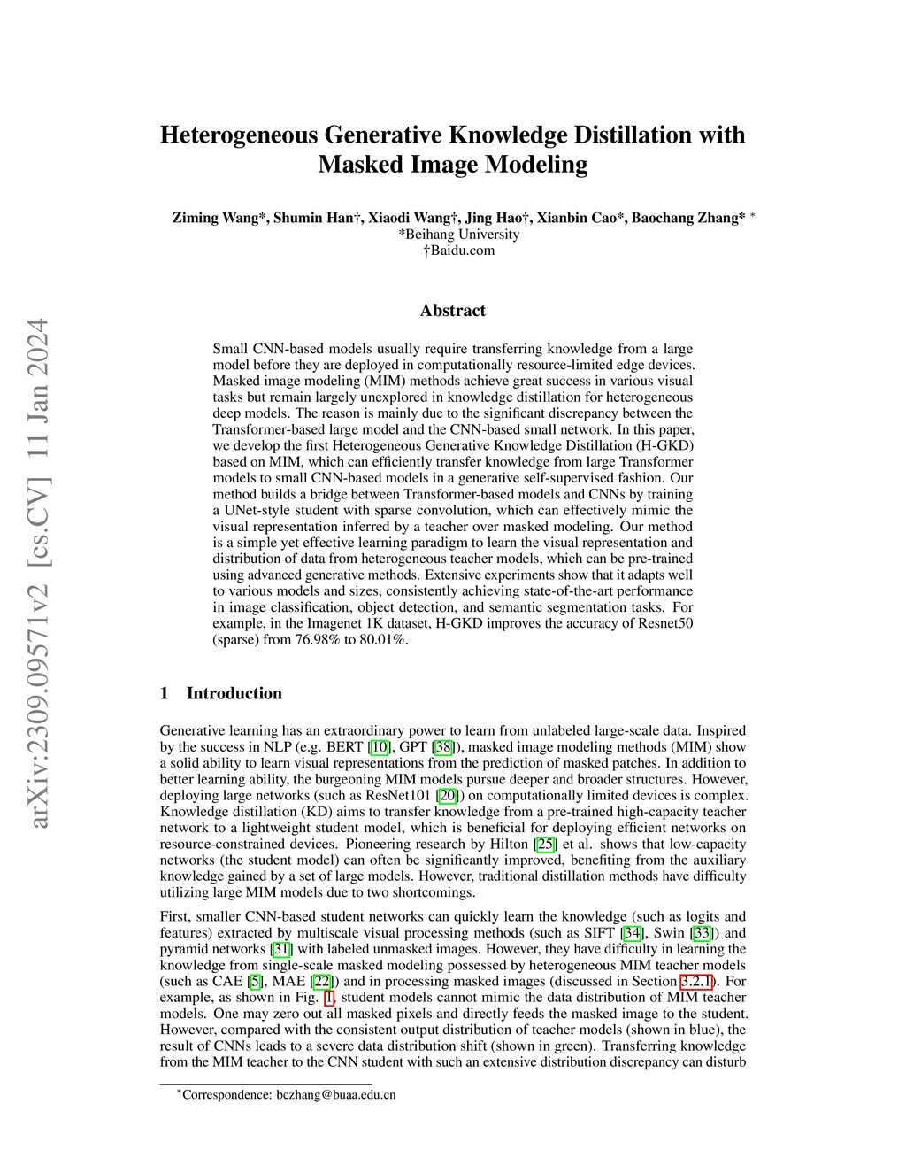 Small CNN-based models usually require transferring knowledge from a large model before they are deployed in computationally resource-limited edge devices. Masked image modeling (MIM) methods achieve great success in various visual tasks but remain largely unexplored in knowledge distillation for heterogeneous deep models. The reason is mainly due to the significant discrepancy between the Transformer-based large model and the CNN-based small network. In this paper, we develop the first Heterogeneous Generative Knowledge Distillation (H-GKD) based on MIM, which can efficiently transfer knowledge from large Transformer models to small CNN-based models in a generative self-supervised fashion. Our method builds a bridge between Transformer-based models and CNNs by training a UNet-style student with sparse convolution, which can effectively mimic the visual representation inferred by a teacher over masked modeling. Our method is a simple yet effective learning paradigm to learn the visual representation and distribution of data from heterogeneous teacher models, which can be pre-trained using advanced generative methods. Extensive experiments show that it adapts well to various models and sizes, consistently achieving state-of-the-art performance in image classification, object detection, and semantic segmentation tasks. For example, in the Imagenet 1K dataset, H-GKD improves the accuracy of Resnet50 (sparse) from 76.98% to 80.01%.