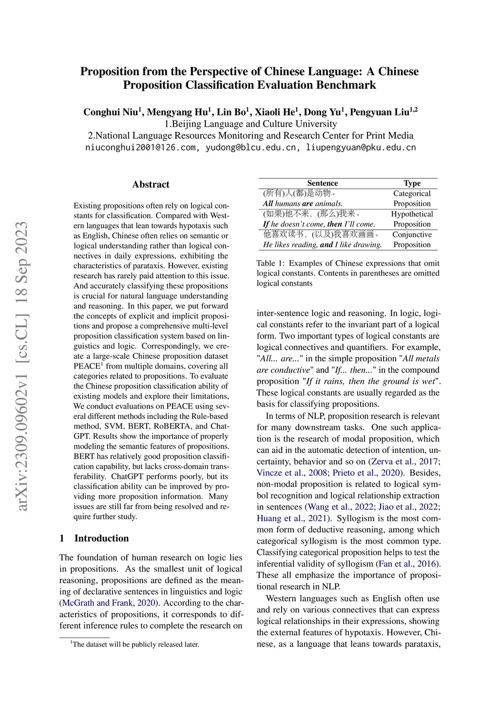 Existing propositions often rely on logical constants for classification. Compared with Western languages that lean towards hypotaxis such as English, Chinese often relies on semantic or logical understanding rather than logical connectives in daily expressions, exhibiting the characteristics of parataxis. However, existing research has rarely paid attention to this issue. And accurately classifying these propositions is crucial for natural language understanding and reasoning. In this paper, we put forward the concepts of explicit and implicit propositions and propose a comprehensive multi-level proposition classification system based on linguistics and logic. Correspondingly, we create a large-scale Chinese proposition dataset PEACE from multiple domains, covering all categories related to propositions. To evaluate the Chinese proposition classification ability of existing models and explore their limitations, We conduct evaluations on PEACE using several different methods including the Rule-based method, SVM, BERT, RoBERTA, and ChatGPT. Results show the importance of properly modeling the semantic features of propositions. BERT has relatively good proposition classification capability, but lacks cross-domain transferability. ChatGPT performs poorly, but its classification ability can be improved by providing more proposition information. Many issues are still far from being resolved and require further study.