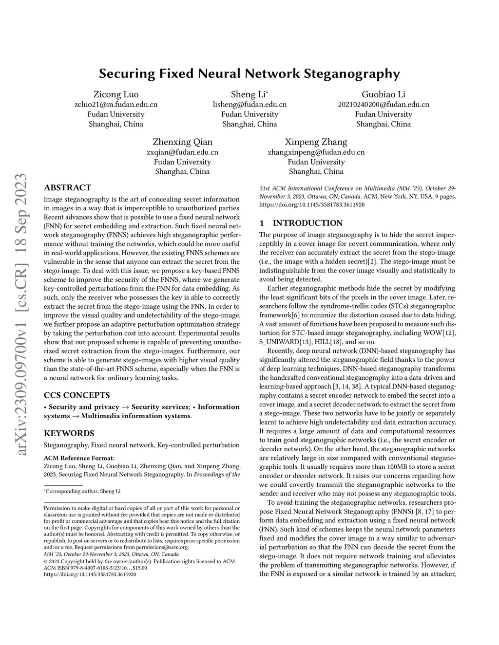 Securing Fixed Neural Network Steganography