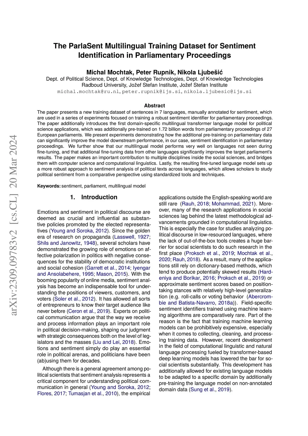 Sentiments inherently drive politics. How we receive and process information plays an essential role in political decision-making, shaping our judgment with strategic consequences both on the level of legislators and the masses. If sentiment plays such an important role in politics, how can we study and measure it systematically? The paper presents a new dataset of sentiment-annotated sentences, which are used in a series of experiments focused on training a robust sentiment classifier for parliamentary proceedings. The paper also introduces the first domain-specific LLM for political science applications additionally pre-trained on 1.72 billion domain-specific words from proceedings of 27 European parliaments. We present experiments demonstrating how the additional pre-training of LLM on parliamentary data can significantly improve the model downstream performance on the domain-specific tasks, in our case, sentiment detection in parliamentary proceedings. We further show that multilingual models perform very well on unseen languages and that additional data from other languages significantly improves the target parliament's results. The paper makes an important contribution to multiple domains of social sciences and bridges them with computer science and computational linguistics. Lastly, it sets up a more robust approach to sentiment analysis of political texts in general, which allows scholars to study political sentiment from a comparative perspective using standardized tools and techniques.