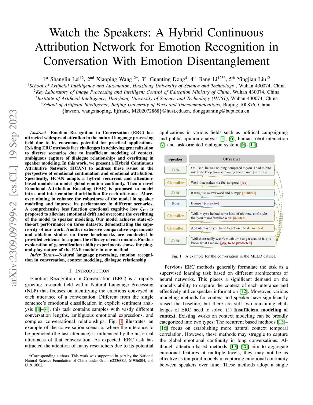 Watch the Speakers: A Hybrid Continuous Attribution Network for Emotion