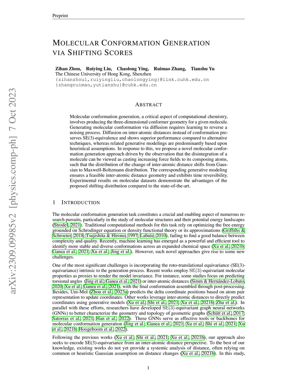Molecular conformation generation, a critical aspect of computational chemistry, involves producing the three-dimensional conformer geometry for a given molecule. Generating molecular conformation via diffusion requires learning to reverse a noising process. Diffusion on inter-atomic distances instead of conformation preserves SE(3)-equivalence and shows superior performance compared to alternative techniques, whereas related generative modelings are predominantly based upon heuristical assumptions. In response to this, we propose a novel molecular conformation generation approach driven by the observation that the disintegration of a molecule can be viewed as casting increasing force fields to its composing atoms, such that the distribution of the change of inter-atomic distance shifts from Gaussian to Maxwell-Boltzmann distribution. The corresponding generative modeling ensures a feasible inter-atomic distance geometry and exhibits time reversibility. Experimental results on molecular datasets demonstrate the advantages of the proposed shifting distribution compared to the state-of-the-art.