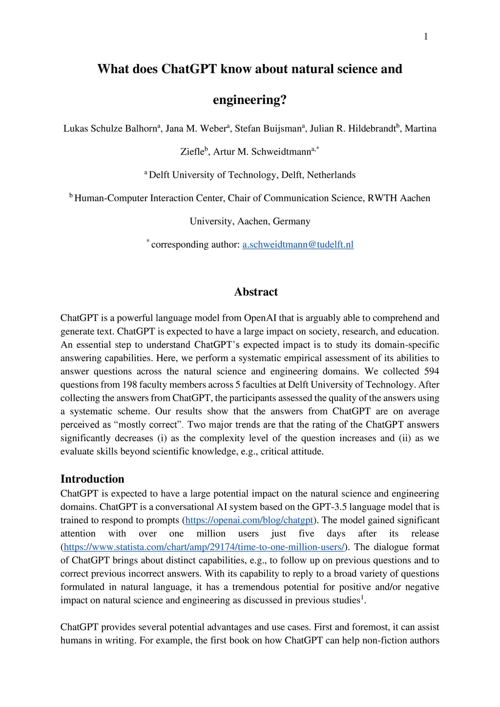 ChatGPT is a powerful language model from OpenAI that is arguably able to comprehend and generate text. ChatGPT is expected to have a large impact on society, research, and education. An essential step to understand ChatGPT's expected impact is to study its domain-specific answering capabilities. Here, we perform a systematic empirical assessment of its abilities to answer questions across the natural science and engineering domains. We collected 594 questions from 198 faculty members across 5 faculties at Delft University of Technology. After collecting the answers from ChatGPT, the participants assessed the quality of the answers using a systematic scheme. Our results show that the answers from ChatGPT are on average perceived as ``mostly correct''. Two major trends are that the rating of the ChatGPT answers significantly decreases (i) as the complexity level of the question increases and (ii) as we evaluate skills beyond scientific knowledge, e.g., critical attitude.