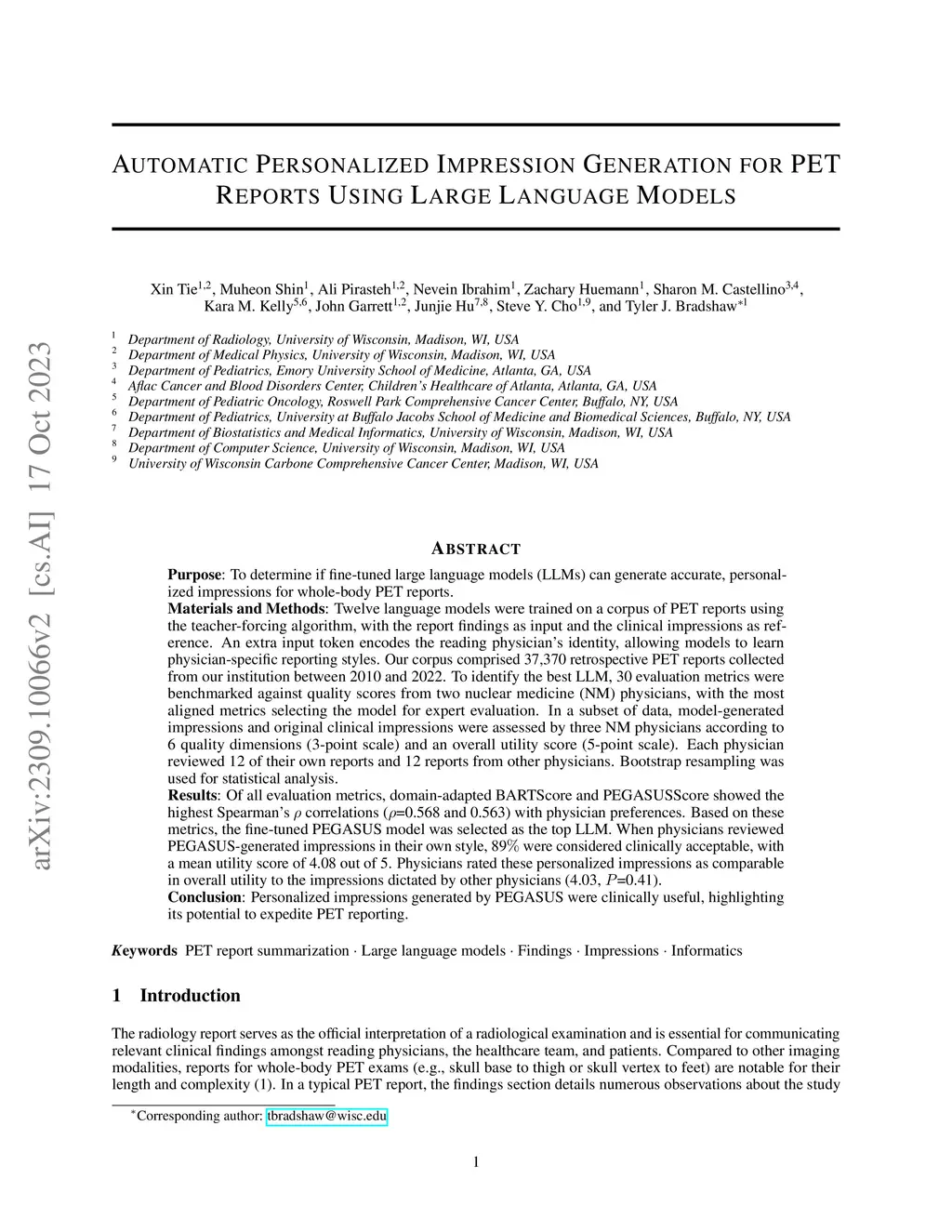 In this study, we aimed to determine if fine-tuned large language models (LLMs) can generate accurate, personalized impressions for whole-body PET reports. Twelve language models were trained on a corpus of PET reports using the teacher-forcing algorithm, with the report findings as input and the clinical impressions as reference. An extra input token encodes the reading physician's identity, allowing models to learn physician-specific reporting styles. Our corpus comprised 37,370 retrospective PET reports collected from our institution between 2010 and 2022. To identify the best LLM, 30 evaluation metrics were benchmarked against quality scores from two nuclear medicine (NM) physicians, with the most aligned metrics selecting the model for expert evaluation. In a subset of data, model-generated impressions and original clinical impressions were assessed by three NM physicians according to 6 quality dimensions (3-point scale) and an overall utility score (5-point scale). Each physician reviewed 12 of their own reports and 12 reports from other physicians. Bootstrap resampling was used for statistical analysis. Of all evaluation metrics, domain-adapted BARTScore and PEGASUSScore showed the highest Spearman's rank correlations (0.568 and 0.563) with physician preferences. Based on these metrics, the fine-tuned PEGASUS model was selected as the top LLM. When physicians reviewed PEGASUS-generated impressions in their own style, 89% were considered clinically acceptable, with a mean utility score of 4.08 out of 5. Physicians rated these personalized impressions as comparable in overall utility to the impressions dictated by other physicians (4.03, P=0.41). In conclusion, personalized impressions generated by PEGASUS were clinically useful, highlighting its potential to expedite PET reporting.