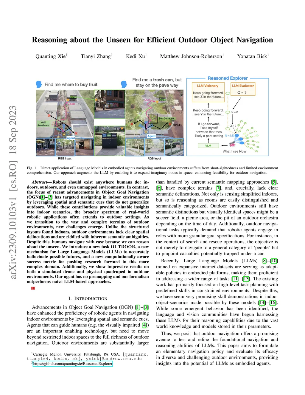 Robots should exist anywhere humans do: indoors, outdoors, and even unmapped environments. In contrast, the focus of recent advancements in Object Goal Navigation(OGN) has targeted navigating in indoor environments by leveraging spatial and semantic cues that do not generalize outdoors. While these contributions provide valuable insights into indoor scenarios, the broader spectrum of real-world robotic applications often extends to outdoor settings. As we transition to the vast and complex terrains of outdoor environments, new challenges emerge. Unlike the structured layouts found indoors, outdoor environments lack clear spatial delineations and are riddled with inherent semantic ambiguities. Despite this, humans navigate with ease because we can reason about the unseen. We introduce a new task OUTDOOR, a new mechanism for Large Language Models (LLMs) to accurately hallucinate possible futures, and a new computationally aware success metric for pushing research forward in this more complex domain. Additionally, we show impressive results on both a simulated drone and physical quadruped in outdoor environments. Our agent has no premapping and our formalism outperforms naive LLM-based approaches