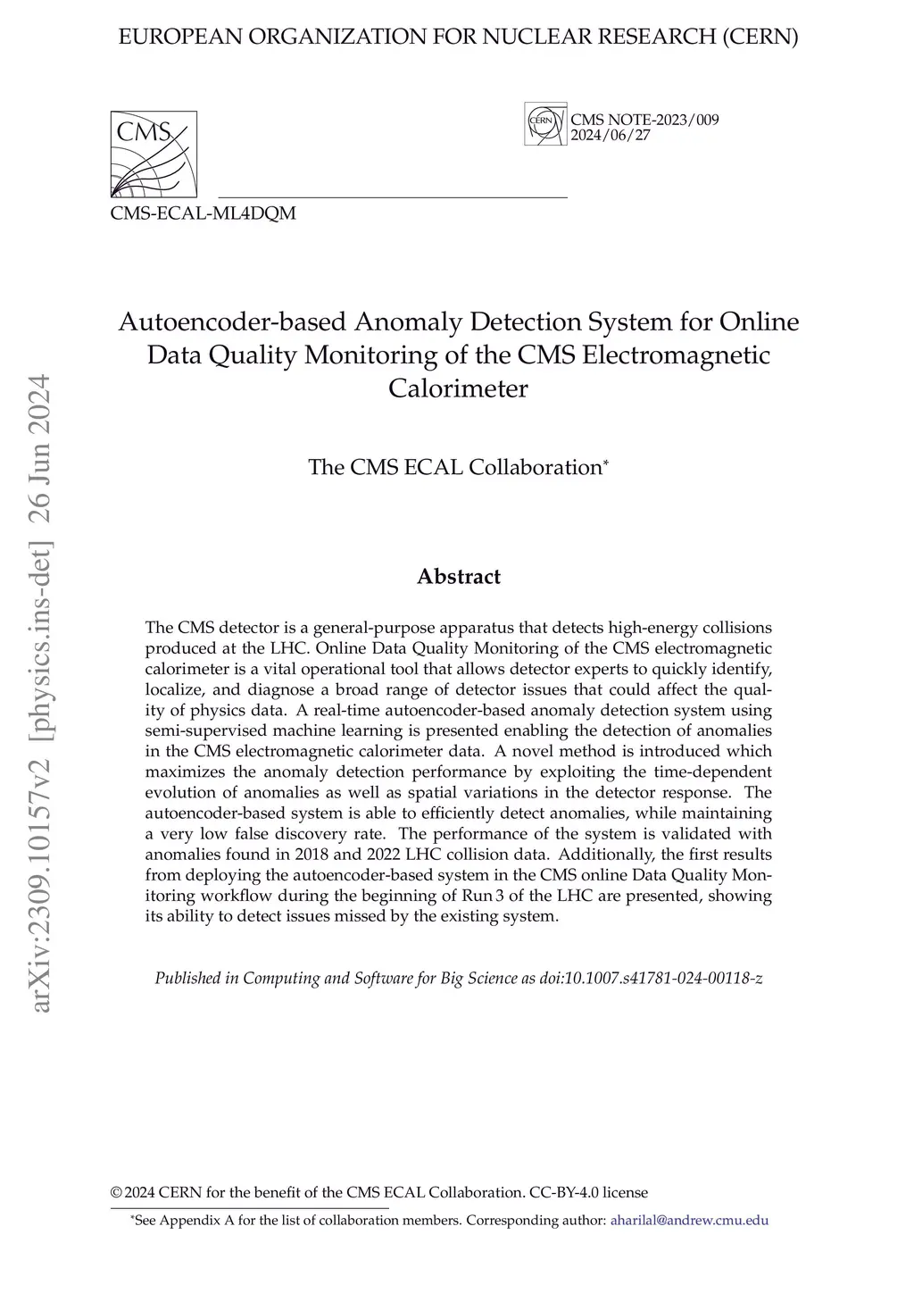 The CMS detector is a general-purpose apparatus that detects high-energy collisions produced at the LHC. Online Data Quality Monitoring of the CMS electromagnetic calorimeter is a vital operational tool that allows detector experts to quickly identify, localize, and diagnose a broad range of detector issues that could affect the quality of physics data. A real-time autoencoder-based anomaly detection system using semi-supervised machine learning is presented enabling the detection of anomalies in the CMS electromagnetic calorimeter data. A novel method is introduced which maximizes the anomaly detection performance by exploiting the time-dependent evolution of anomalies as well as spatial variations in the detector response. The autoencoder-based system is able to efficiently detect anomalies, while maintaining a very low false discovery rate. The performance of the system is validated with anomalies found in 2018 and 2022 LHC collision data. Additionally, the first results from deploying the autoencoder-based system in the CMS online Data Quality Monitoring workflow during the beginning of Run 3 of the LHC are presented, showing its ability to detect issues missed by the existing system.