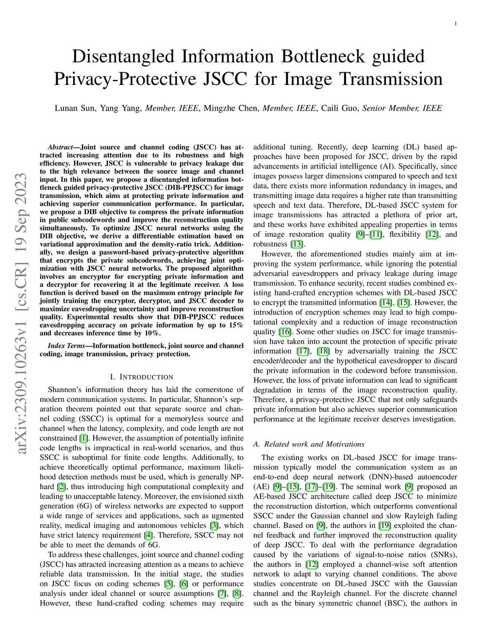 Joint source and channel coding (JSCC) has attracted increasing attention due to its robustness and high efficiency. However, JSCC is vulnerable to privacy leakage due to the high relevance between the source image and channel input. In this paper, we propose a disentangled information bottleneck guided privacy-protective JSCC (DIB-PPJSCC) for image transmission, which aims at protecting private information as well as achieving superior communication performance at the legitimate receiver. In particular, we propose a DIB objective to disentangle private and public information. The goal is to compress the private information in the public subcodewords, preserve the private information in the private subcodewords and improve the reconstruction quality simultaneously. In order to optimize JSCC neural networks using the DIB objective, we derive a differentiable estimation of the DIB objective based on the variational approximation and the density-ratio trick. Additionally, we design a password-based privacy-protective (PP) algorithm which can be jointly optimized with JSCC neural networks to encrypt the private subcodewords. Specifically, we employ a private information encryptor to encrypt the private subcodewords before transmission, and a corresponding decryptor to recover the private information at the legitimate receiver. A loss function for jointly training the encryptor, decryptor and JSCC decoder is derived based on the maximum entropy principle, which aims at maximizing the eavesdropping uncertainty as well as improving the reconstruction quality. Experimental results show that DIB-PPJSCC can reduce the eavesdropping accuracy on private information up to and reduce inference time compared to existing privacy-protective JSCC and traditional separate methods.