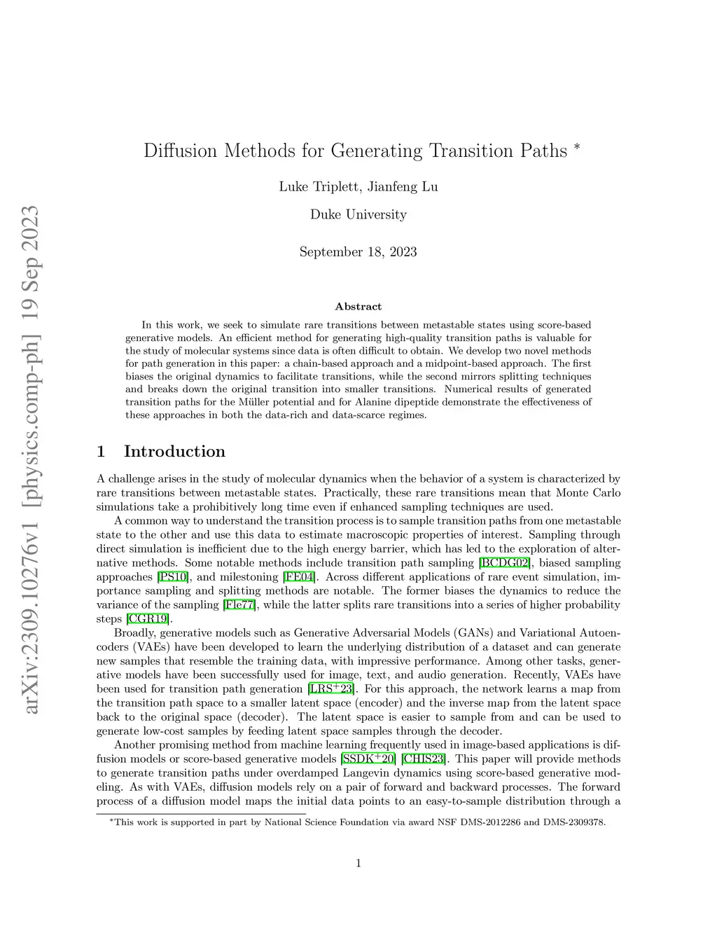 In this work, we seek to simulate rare transitions between metastable states using score-based generative models. An efficient method for generating high-quality transition paths is valuable for the study of molecular systems since data is often difficult to obtain. We develop two novel methods for path generation in this paper: a chain-based approach and a midpoint-based approach. The first biases the original dynamics to facilitate transitions, while the second mirrors splitting techniques and breaks down the original transition into smaller transitions. Numerical results of generated transition paths for the M\"uller potential and for Alanine dipeptide demonstrate the effectiveness of these approaches in both the data-rich and data-scarce regimes.