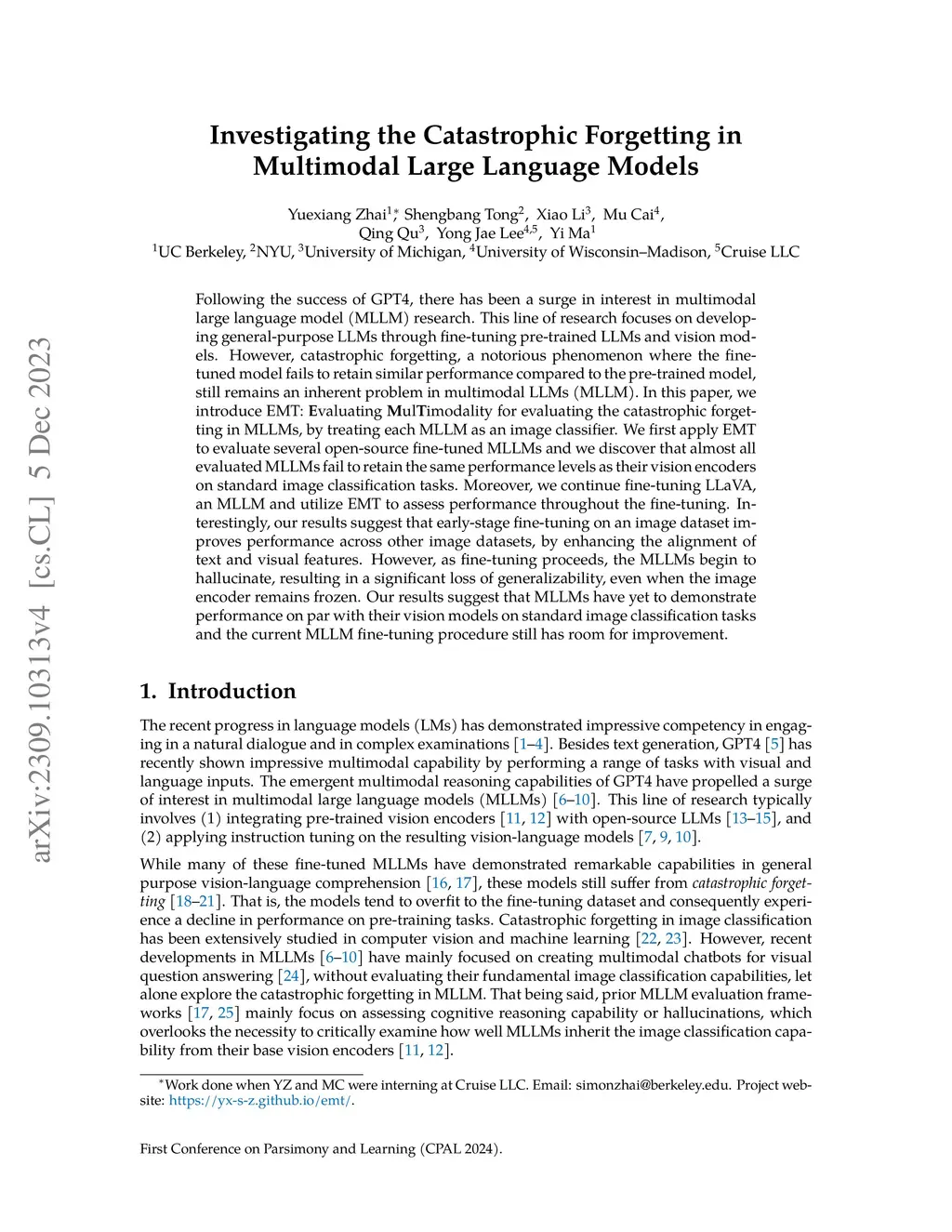 Following the success of GPT4, there has been a surge in interest in multimodal large language model (MLLM) research. This line of research focuses on developing general-purpose LLMs through fine-tuning pre-trained LLMs and vision models. However, catastrophic forgetting, a notorious phenomenon where the fine-tuned model fails to retain similar performance compared to the pre-trained model, still remains an inherent problem in multimodal LLMs (MLLM). In this paper, we introduce EMT: Evaluating MulTimodality for evaluating the catastrophic forgetting in MLLMs, by treating each MLLM as an image classifier. We first apply EMT to evaluate several open-source fine-tuned MLLMs and we discover that almost all evaluated MLLMs fail to retain the same performance levels as their vision encoders on standard image classification tasks. Moreover, we continue fine-tuning LLaVA, an MLLM and utilize EMT to assess performance throughout the fine-tuning. Interestingly, our results suggest that early-stage fine-tuning on an image dataset improves performance across other image datasets, by enhancing the alignment of text and visual features. However, as fine-tuning proceeds, the MLLMs begin to hallucinate, resulting in a significant loss of generalizability, even when the image encoder remains frozen. Our results suggest that MLLMs have yet to demonstrate performance on par with their vision models on standard image classification tasks and the current MLLM fine-tuning procedure still has room for improvement.