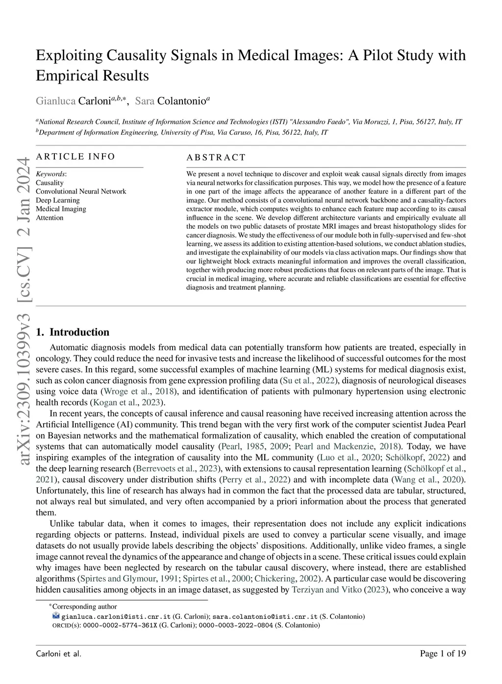 We present a novel technique to discover and exploit weak causal signals directly from images via neural networks for classification purposes. This way, we model how the presence of a feature in one part of the image affects the appearance of another feature in a different part of the image. Our method consists of a convolutional neural network backbone and a causality-factors extractor module, which computes weights to enhance each feature map according to its causal influence in the scene. We develop different architecture variants and empirically evaluate all the models on two public datasets of prostate MRI images and breast histopathology slides for cancer diagnosis. We study the effectiveness of our module both in fully-supervised and few-shot learning, we assess its addition to existing attention-based solutions, we conduct ablation studies, and investigate the explainability of our models via class activation maps. Our findings show that our lightweight block extracts meaningful information and improves the overall classification, together with producing more robust predictions that focus on relevant parts of the image. That is crucial in medical imaging, where accurate and reliable classifications are essential for effective diagnosis and treatment planning.