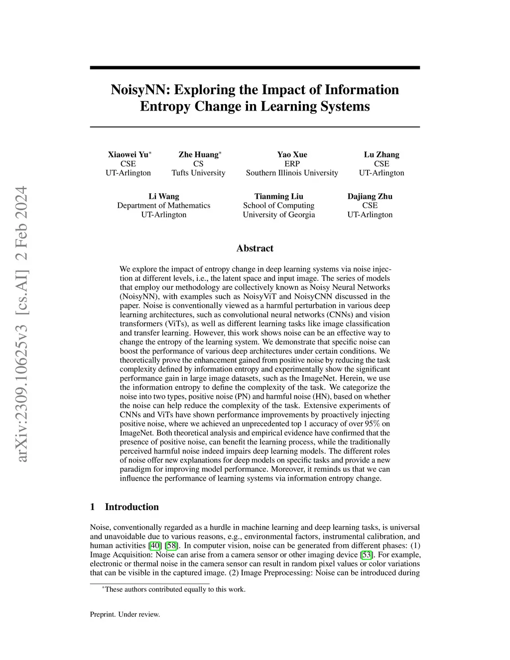 We investigate the impact of entropy change in deep learning systems by noise injection at different levels, including the embedding space and the image. The series of models that employ our methodology are collectively known as Noisy Neural Networks (NoisyNN), with examples such as NoisyViT and NoisyCNN. Noise is conventionally viewed as a harmful perturbation in various deep learning architectures, such as convolutional neural networks (CNNs) and vision transformers (ViTs), as well as different learning tasks like image classification and transfer learning. However, this work shows noise can be an effective way to change the entropy of the learning system. We demonstrate that specific noise can boost the performance of various deep models under certain conditions. We theoretically prove the enhancement gained from positive noise by reducing the task complexity defined by information entropy and experimentally show the significant performance gain in large image datasets, such as the ImageNet. Herein, we use the information entropy to define the complexity of the task. We categorize the noise into two types, positive noise (PN) and harmful noise (HN), based on whether the noise can help reduce the task complexity. Extensive experiments of CNNs and ViTs have shown performance improvements by proactively injecting positive noise, where we achieved an unprecedented top 1 accuracy of 95 on ImageNet. Both theoretical analysis and empirical evidence have confirmed that the presence of positive noise, can benefit the learning process, while the traditionally perceived harmful noise indeed impairs deep learning models. The different roles of noise offer new explanations for deep models on specific tasks and provide a new paradigm for improving model performance. Moreover, it reminds us that we can influence the performance of learning systems via information entropy change.