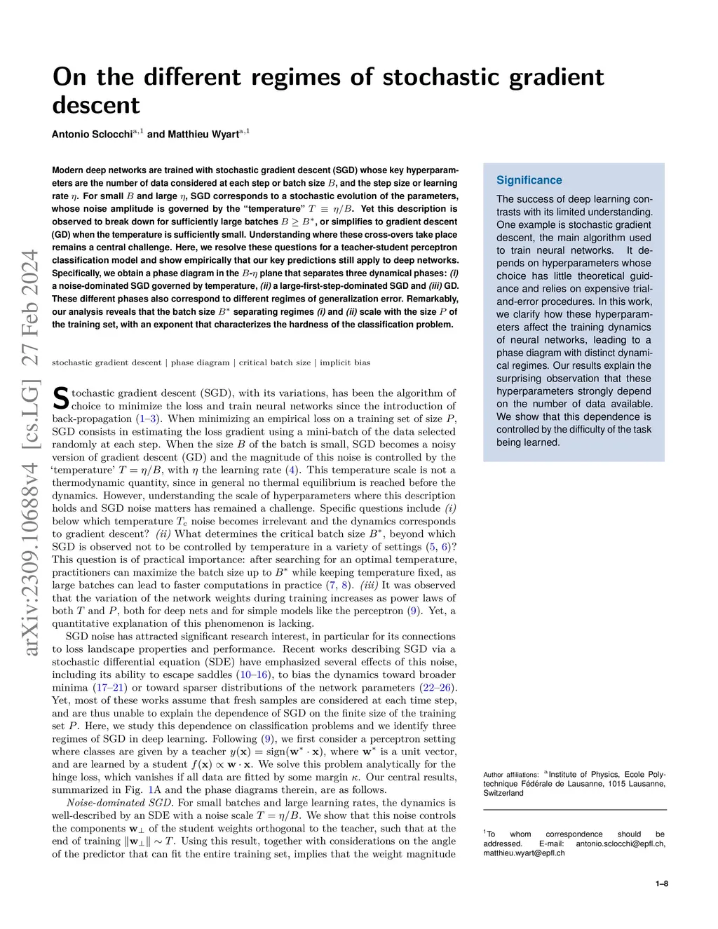 Modern deep networks are trained with stochastic gradient descent (SGD) whose key hyperparameters are the number of data considered at each step or batch size , and the step size or learning rate . For small and large , SGD corresponds to a stochastic evolution of the parameters, whose noise amplitude is governed by the ''temperature'' . Yet this description is observed to break down for sufficiently large batches , or simplifies to gradient descent (GD) when the temperature is sufficiently small. Understanding where these cross-overs take place remains a central challenge. Here, we resolve these questions for a teacher-student perceptron classification model and show empirically that our key predictions still apply to deep networks. Specifically, we obtain a phase diagram in the - plane that separates three dynamical phases: (i) a noise-dominated SGD governed by temperature, (ii) a large-first-step-dominated SGD and (iii) GD. These different phases also correspond to different regimes of generalization error. Remarkably, our analysis reveals that the batch size separating regimes (i) and (ii) scale with the size of the training set, with an exponent that characterizes the hardness of the classification problem.