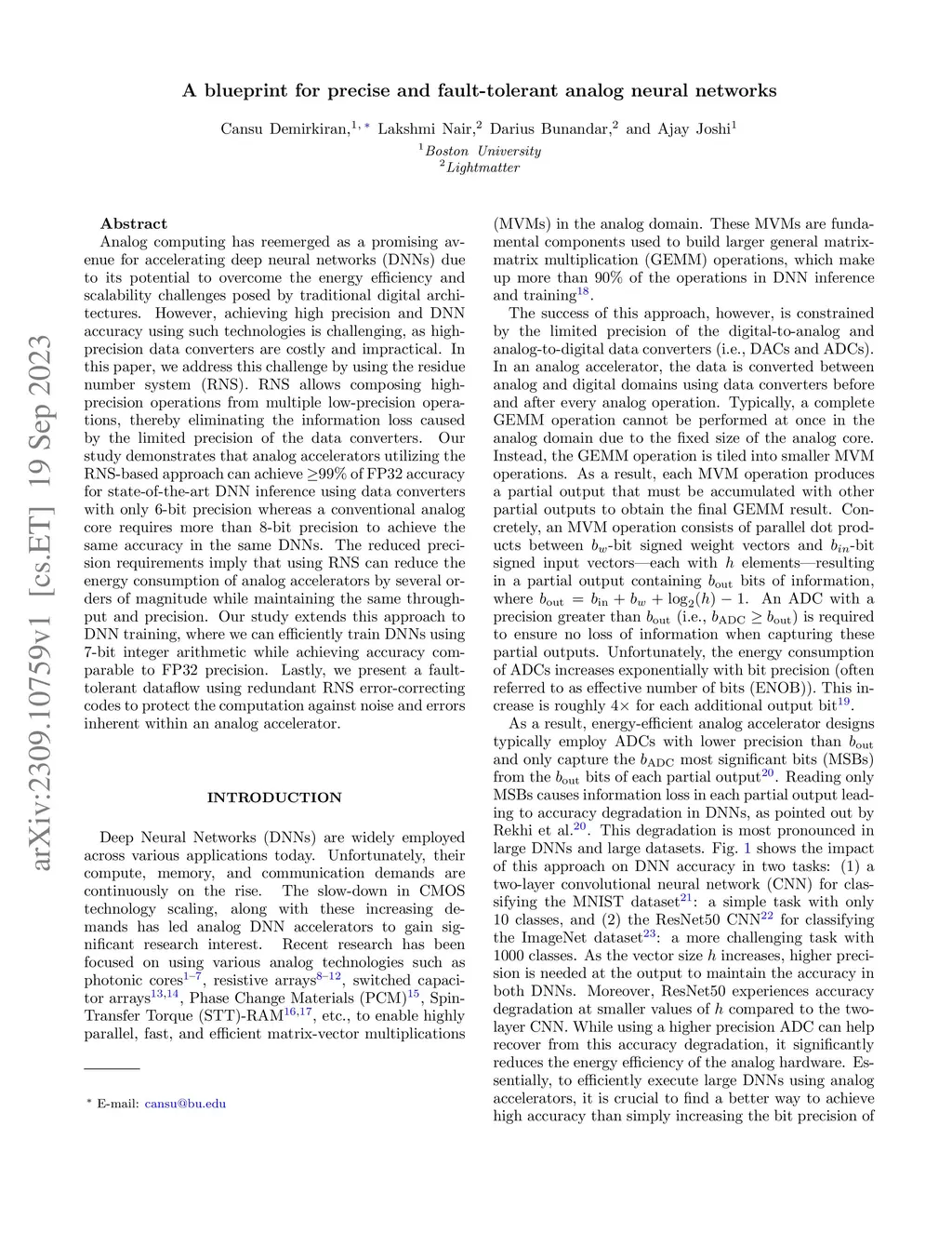 Analog computing has reemerged as a promising avenue for accelerating deep neural networks (DNNs) due to its potential to overcome the energy efficiency and scalability challenges posed by traditional digital architectures. However, achieving high precision and DNN accuracy using such technologies is challenging, as high-precision data converters are costly and impractical. In this paper, we address this challenge by using the residue number system (RNS). RNS allows composing high-precision operations from multiple low-precision operations, thereby eliminating the information loss caused by the limited precision of the data converters. Our study demonstrates that analog accelerators utilizing the RNS-based approach can achieve of FP32 accuracy for state-of-the-art DNN inference using data converters with only -bit precision whereas a conventional analog core requires more than -bit precision to achieve the same accuracy in the same DNNs. The reduced precision requirements imply that using RNS can reduce the energy consumption of analog accelerators by several orders of magnitude while maintaining the same throughput and precision. Our study extends this approach to DNN training, where we can efficiently train DNNs using -bit integer arithmetic while achieving accuracy comparable to FP32 precision. Lastly, we present a fault-tolerant dataflow using redundant RNS error-correcting codes to protect the computation against noise and errors inherent within an analog accelerator.